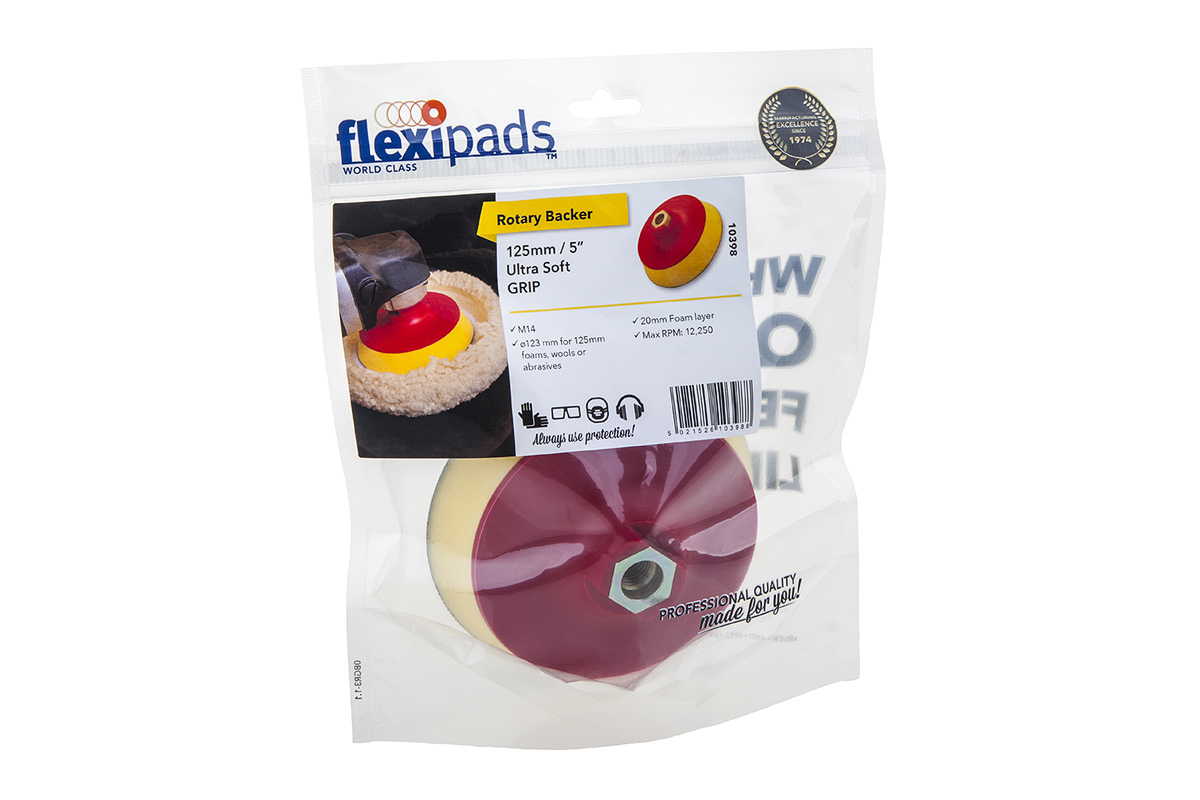 Подошва ультрамягкая 125 мм с резьбой М14 для роторных машинок. Хорошо работает на криволинейных и угловых поверхностях. Имеет термостойкое крепление Velcro Micro-Hook и рассчитана на максимальную частоту вращения 12 250 об./мин.