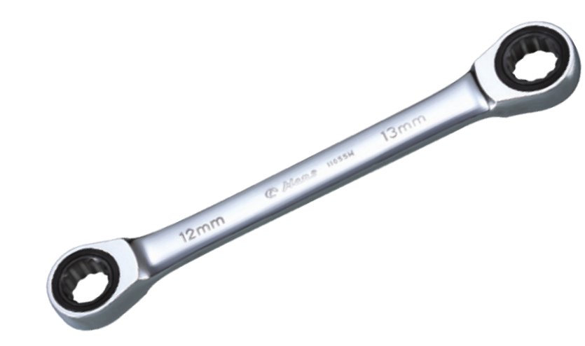 Накидной гаечный ключ с трещоточным механизмом представляет собой конструкцию, состоящую из двух накидных профилей самых популярных или соседних размеров. Накидной профиль ключа имеет трещоточный механизм с 72 зубами. Благодаря применению хромванадиевой стали марки 6140 и правильно проведенной закалке механизм способен выдерживать высокий крутящий момент. Малый (5°) обратный ход делает ключ незаменимым при работе в ограниченном рабочем пространстве. Ключ изготовлен по стандарту DIN, имеет трехслойное хромоникелевое покрытие, обеспечивающее повышенную стойкость к коррозии. Применяется при проведении широкого спектра слесарных работ.