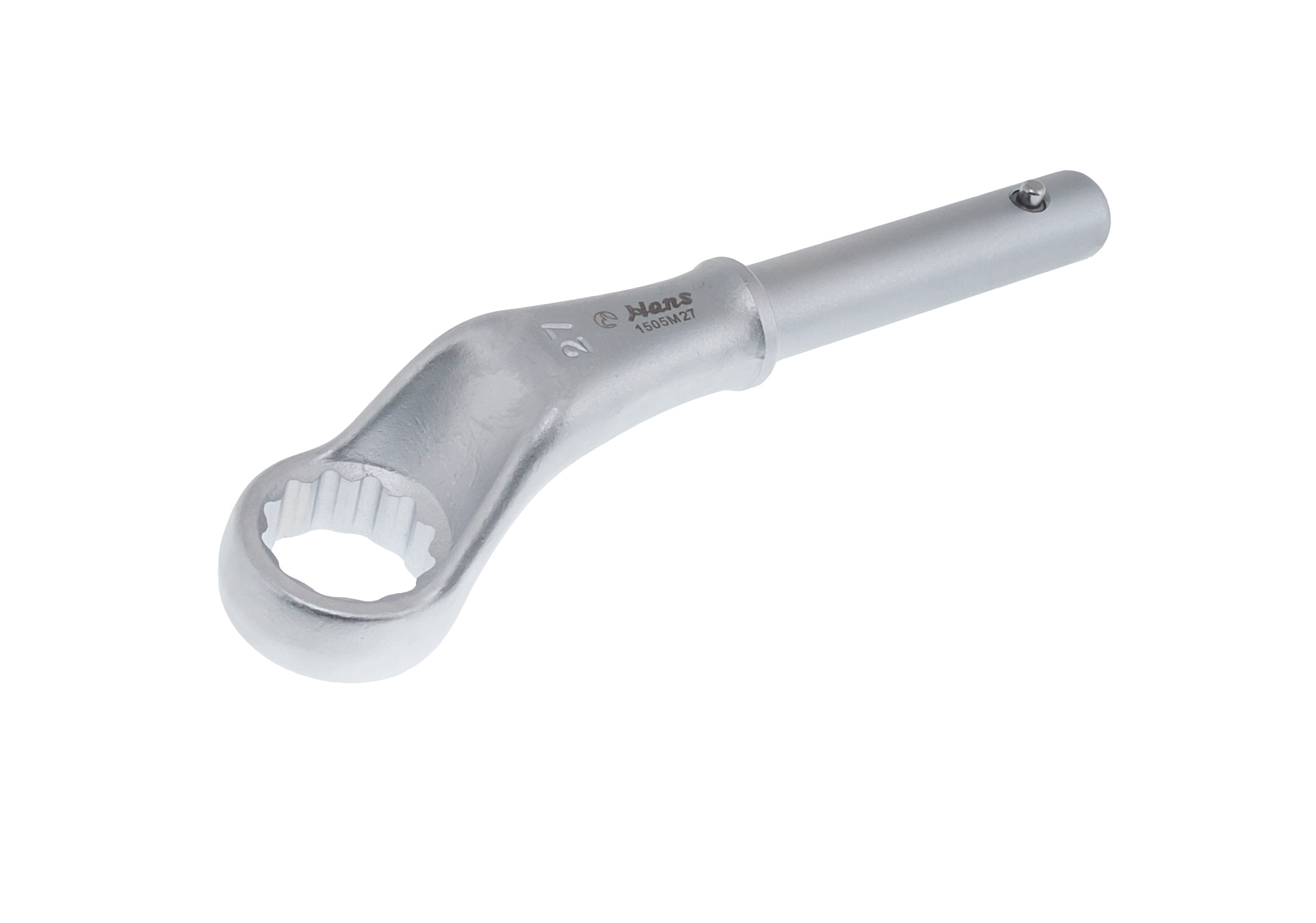 1505M27 Ключ накидной усиленный 70град., 27мм Ключ серии 1505 предназначен для работы с крепежом конструкций и техники, для ремонта и обслуживания крупногабаритной техники и конструкций, промышленности, сельского хозяйства, производства, строительства, станций технического обслуживания автомобильной и другой техники. Можно использовать ключ в тяжелых условиях под действием больших нагрузок. Для использования совместно с рычагом-трубой 1505PE18 Накидная рабочая часть ключа отогнутая на 700 позволяет работать в местах с ограниченным доступом к крепежу. 12-тигранный профиль накидной части универсален в работе с головками болтов или гайками как 6- ти, так и 12-тигранного профиля. Ключи изготовлены из инструментальной легированной хром-ванадиевой стали, соответствующей требованиям стандартов DIN3113, ISO 7738.