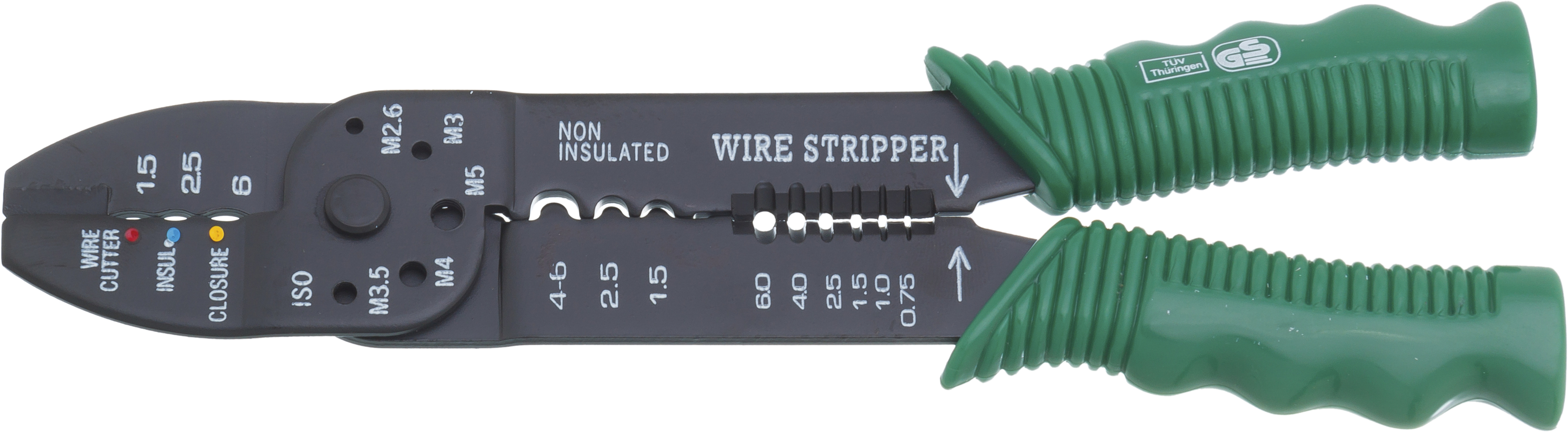 1932-9 Клещи для зачистки и обжимки проводов , 225 мм 5 функций в одном инструменте: *Резка проводов диаметром до 6 мм² *Снятие изоляции 0.75-6.0 мм² *Опрессовка изолированных наконечников 1.5 - 6.0мм² *Опрессовка не изолированных наконечников 1.5 - 6.0 *Резка болтов М2.5 –М5.0