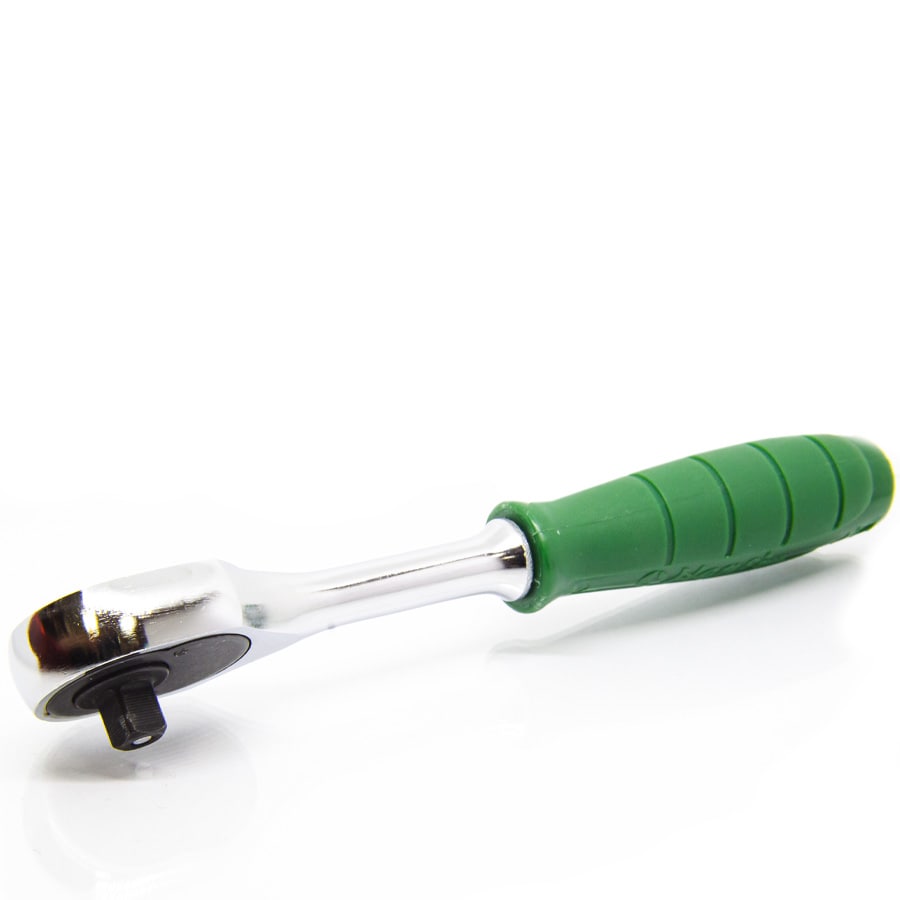 Назначение: Используется при работах с мелким крепежом в автосервисах, гараже или быту. Описание: Трещотка имеет 24-зубцовый механизм с флажковым переключателем. Эргономичная ручка из маслобензостойкого пластика позволяет не проскальзывать рукоятке во время работы. Кнопка быстрого сброса позволяет оперативно заменять инструмент: торцевую головку, удлинитель, карданный шарнир или адаптер-переходник. Привод с шагом 150 дает возможность работать в ограниченном пространстве и прикладывать высокие усилия. Механизм имеет устойчивость к загрязнениям и отличается простотой в обслуживании. Ограничения: Трещотку не рекомендуется использовать на начальной стадии отворачивания резьбовых соединений, если они могли быть подверженны коррозии или был использован фиксатор резьбовых соединений. Желательно сначала "стронуть" соединение мощным приводом: Г-образным или Т-образным воротком.