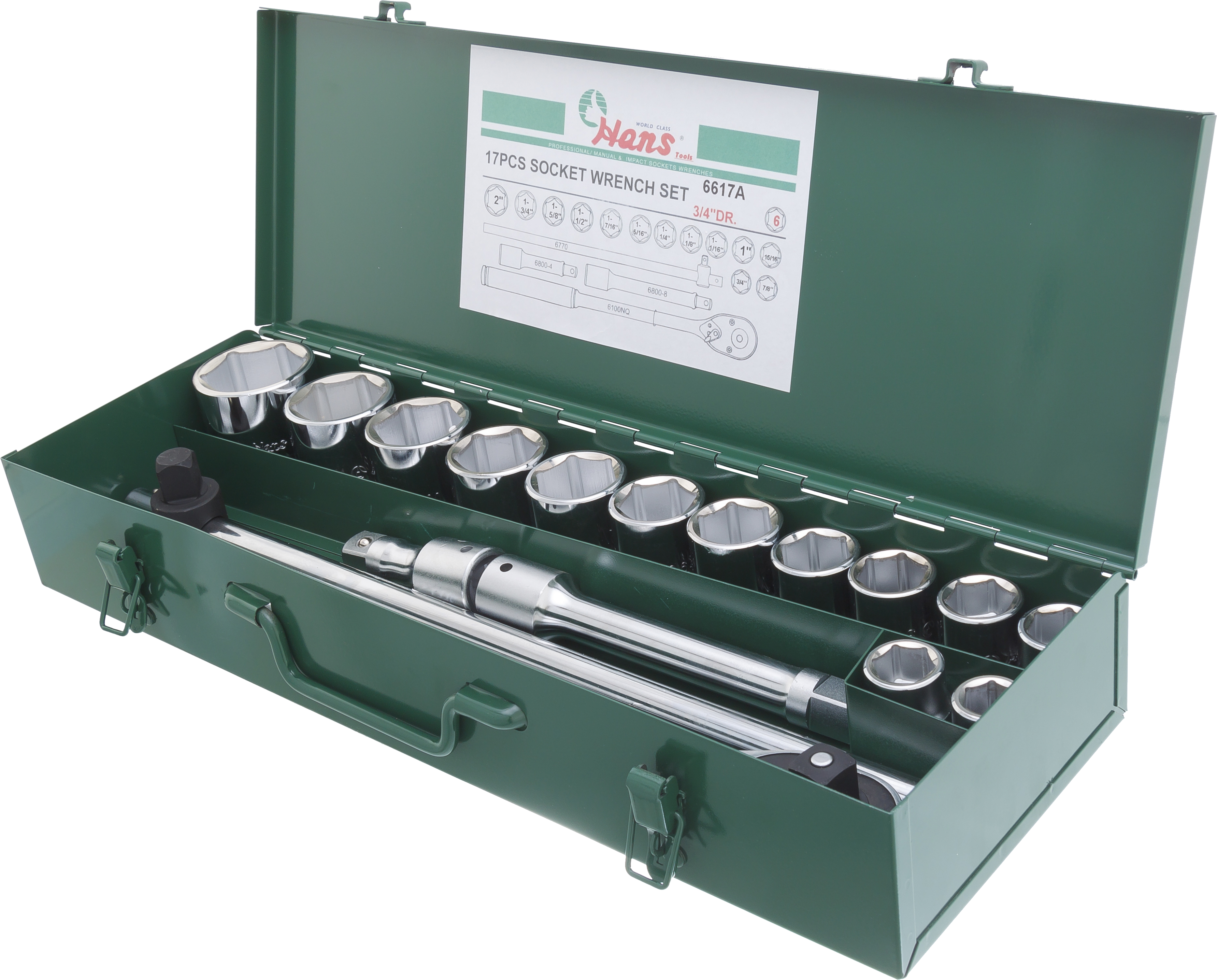 6400А -Торцевые головки 3/4"– 3/4",7/8",15/16",1",1-1/16",1-1/8",1-1/4",1-5/16",1-7/16",1-1/2",1-5/8",1-3/4",2" 6100NQ – Трещотка с быстрым сбросом 3/4"– 24 зуб., 500мм 6770 – Вороток Т-образный 3/4", 500мм 6800-4,8 – Удлинители 3/4" , 100мм, 200мм Металлический кейс 534 x 178 x 78 мм Торцевые головки 6-граней