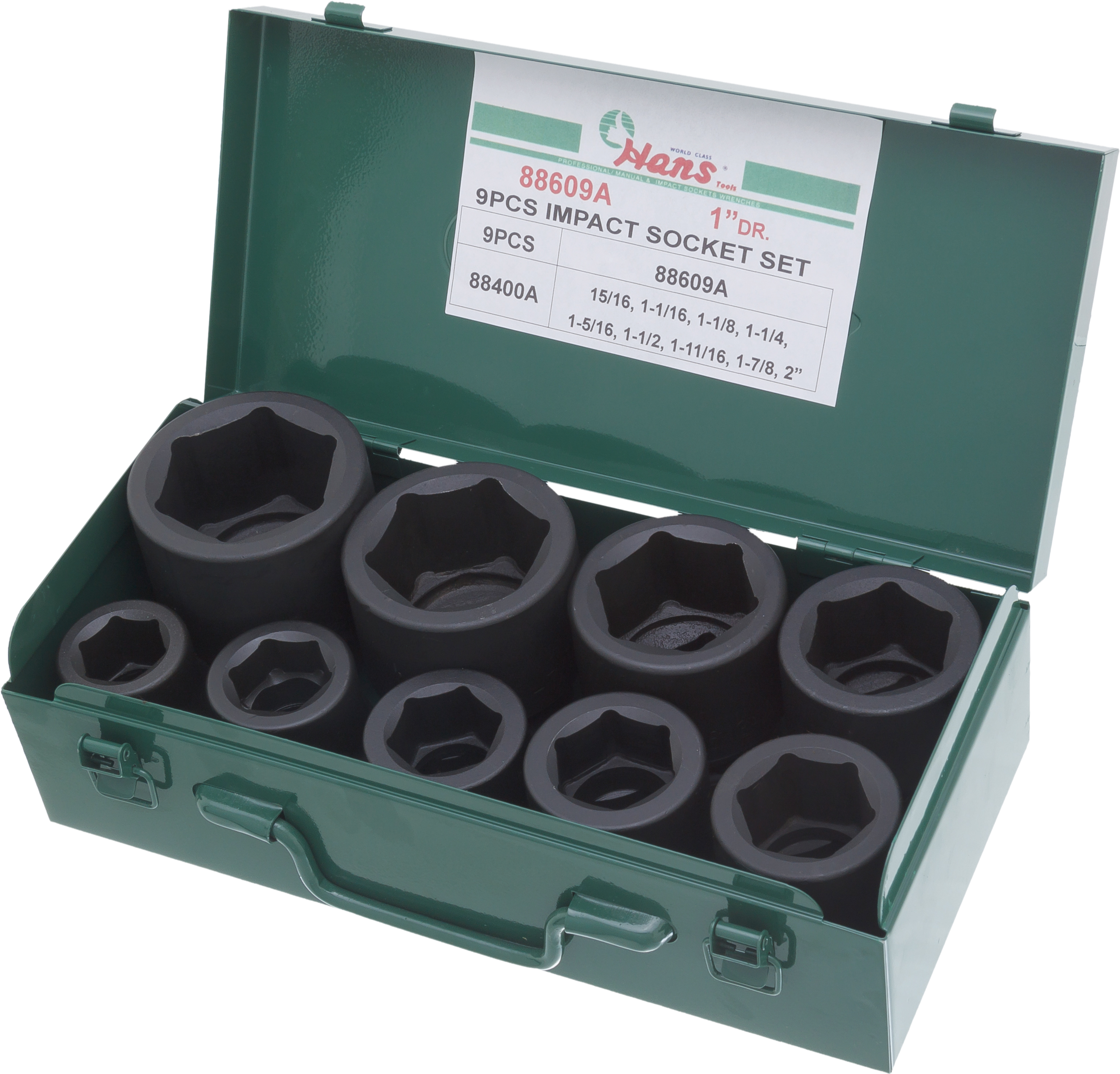Набор 88609A 9 ударных дюймовых головок 1'' в мет. кейсе 88400A — 15/16, 1-1/16, 1-1/8, 1-1/4, 1-5/16, 1-1/2, 1-11/16, 1-7/8, 2'' Высота — 60-82мм