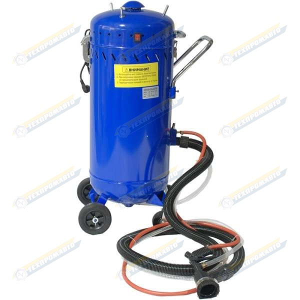 - Это передвижное устройство, сконструировано как герметичный бак емкостью 106 литров, установленный на тележке с транспортировочной ручкой, колесами и упором для ступора агрегата во время работы. Аппарат легко перемещается в пределах рабочей площадки или мастерской даже при полной загрузке.