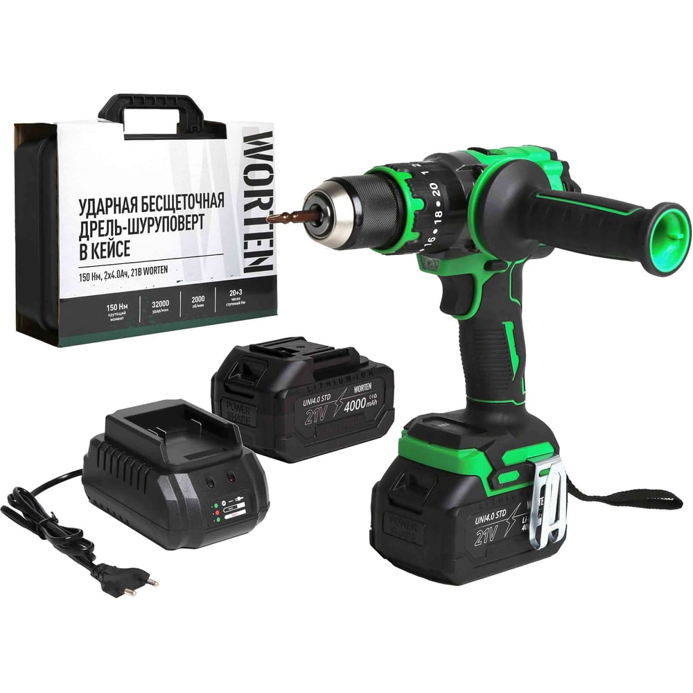 Аккумуляторная ударная бесщеточная дрель-шуруповерт в кейсе WORTEN 150 Нм, 2х4.0Ач, 21В КА-90000703