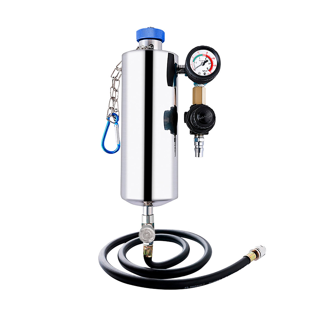 Залить промывочную жидкость в баллон, после чего надежно завернуть горловину и подвесить баллон под капотом автомобиля. Присоединить шланг, идущий от компрессора на входной разъем баллона и осуществить подачу воздуха в систему. Необходимое давление следует выставить ориентируясь на показания манометра с помощью редуктора. После чего открыть кран на подающем шланге и убедиться в герметичности всех соединений.
