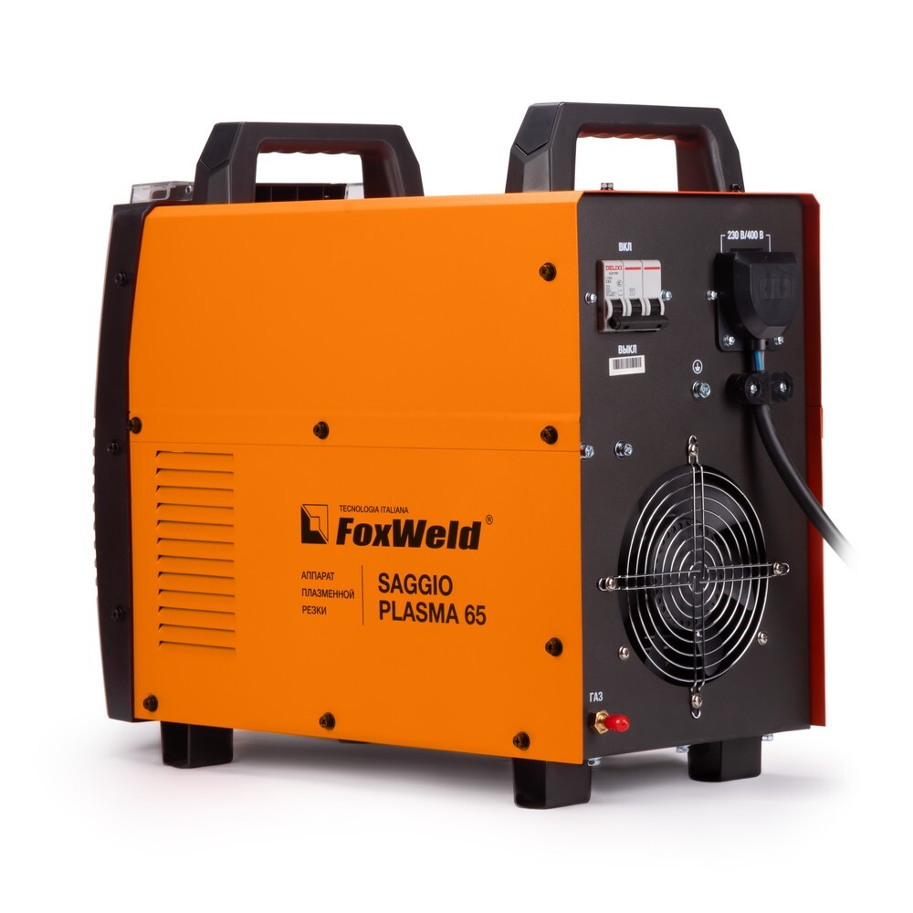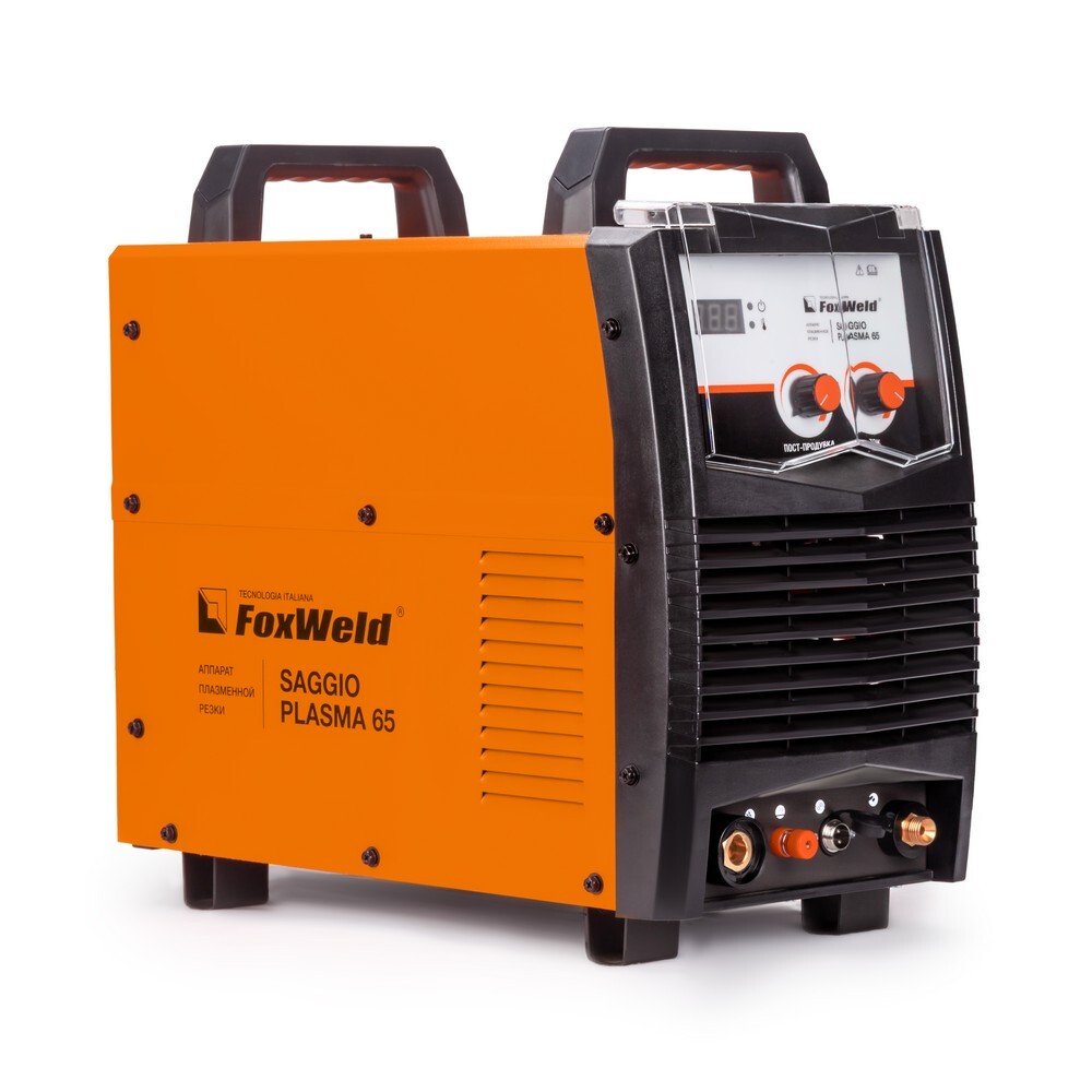 Аппарат плазменной резки FOXWELD SAGGIO PLASMA 65 позволяет разрезать сталь толщиной до 25 мм. SAGGIO PLASMA 65 подходит для резки алюминиевых сплавов, меди, цветных металлов, нержавеющей и углеродистой стали. Дежурная дуга плазмотрона обеспечивает стабильность и удобство, особенно при резке загрязнённых и окрашенных поверхностей. Цифровой дисплей на панели управления отображает установленные значения тока резки. Продувка сжатым воздухом после окончания работ с помощью ручки-регулятора увеличивает срок службы комплектующих частей плазмотрона. Аппарат может работать от сети 230 и 400 В. Такая универсальность увеличивает эффективность (ток реза, расход электроэнергии).ДЕЖУРНАЯ ДУГА: Дежурная дуга плазмотрона (PILOT ARC) – это первичная дуга между электродом и соплом, которая направляется за счёт сжатого воздуха к поверхности. В момент контакта с разрезаемым материалом дежурная дуга гаснет и загорается режущая дуга, что обеспечивает «доступ» режущей дуги к основному материалу. Благодаря этому плазменная струя не гаснет даже на металлической сетке. Аппарат с дежурной дугой отлично подойдёт для резки сеток, загрязнённых, окрашенных и перфорированных поверхностей.ТОЛЩИНА РЕЗА ДО 25 ММ: Благодаря высоким динамическим характеристикам дуги, стабильному току резки и наличию дежурной дуги аппарат способен разрезать металл толщиной до 25 мм.ПОДКЛЮЧЕНИЕ 230 / 400 В: Данный аппарат может работать при напряжении 230 и 400 вольт. Подключение к сети питания 400 вольт увеличивает эффективность аппарата плазменной резки (ток реза, расход электроэнергии).ЦИФРОВОЙ ДИСПЛЕЙ: Цифровой дисплей на панели управления отображает установленные значения тока резки.ЗАЩИТА ПЕРЕДНЕЙ ПАНЕЛИ: Прозрачная пластиковая крышка защищает панель управления аппарата от искр, шлака и других воздействий рабочего процесса.ПРЕИМУЩЕСТВА:Цифровой дисплейДежурная дуга плазмотронаЗащита от перегреваПостпродувка плазмотронаЗащитная крышка панели управленияФУНКЦИОНАЛЬНЫЕ ОСОБЕННОСТИ:ТАБЛИЦА ПОДБОРА КОМПРЕССОРОВ: В таблице ниже - рекомендации по подбору нужного компрессора.КОМПЛЕКТАЦИЯ: Аппарат плазменной резки SAGGIO PLASMA 65 – 1 шт.; Плазмотрон P-80, 4 м – 1 шт.; Кабель заземления с зажимом, 3 м – 1 шт.; Узел подготовки воздуха со скобой для крепления – 1 шт.; Штуцер для подсоединения узла подготовки воздуха – 2 шт.; Газовый шланг, 2,4 м – 1 шт.; Насадка пружинная – 1 шт.; Катод – 2 шт.; Сопло – 2 шт.; Роликовая насадка – 1шт.; Хомут – 4 шт.; Инструкция – 1 шт.; Гарантийный талон – 1 шт.