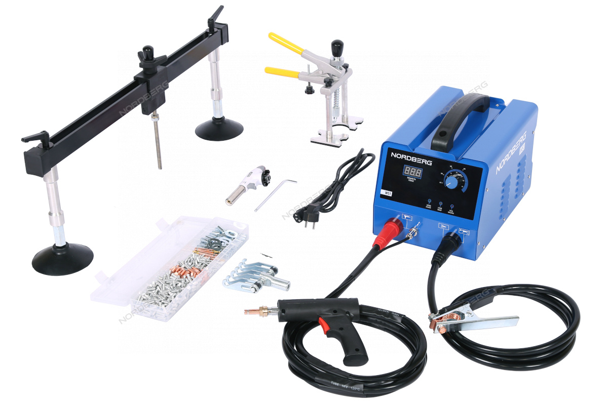 1 сварочный аппарат 1 2 сварочный пистолет в сборе 1 3 кабель массы в сборе с зажимом 1 4 пуллер для быстрого выправления 1 5 многозахватный вытягиватель М10 1 6 пуллер для выправления по алюминию 1 7 газовая горелка 1 8 адаптер М4, М5, М6 4 9 шпилька стальная М6 50 10 шпилька алюминиевая М4 50 11 шпилька алюминиевая М5 50 12 шпилька алюминиевая М6 300 13 ОТ-шайба резьбовая для приварных шпилек M5 6 14 ОТ-шайба резьбовая для приварных шпилек M6 10 15 коробка с аксессуарами 1 16 паспорт-инструкцияТочечный сварочный аппарат для алюминия NORDBERG WS1 – высококачественное оборудование для выполнения большинства операций в автосервисном кузовном ремонте.