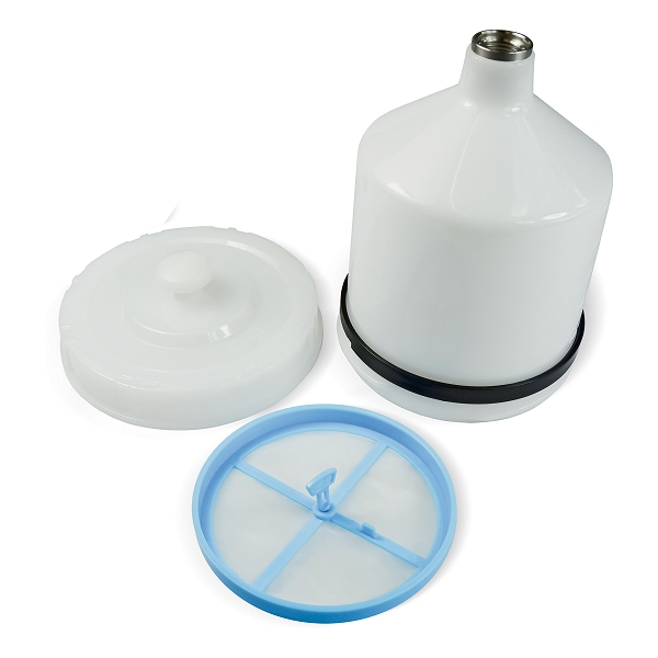Пластиковый бачок в сборе для окрасочных пистолетов Huberth серии 15010. В комплект бачка входит крышка с вентиляционным клапаном и сменный вставной фильтр.