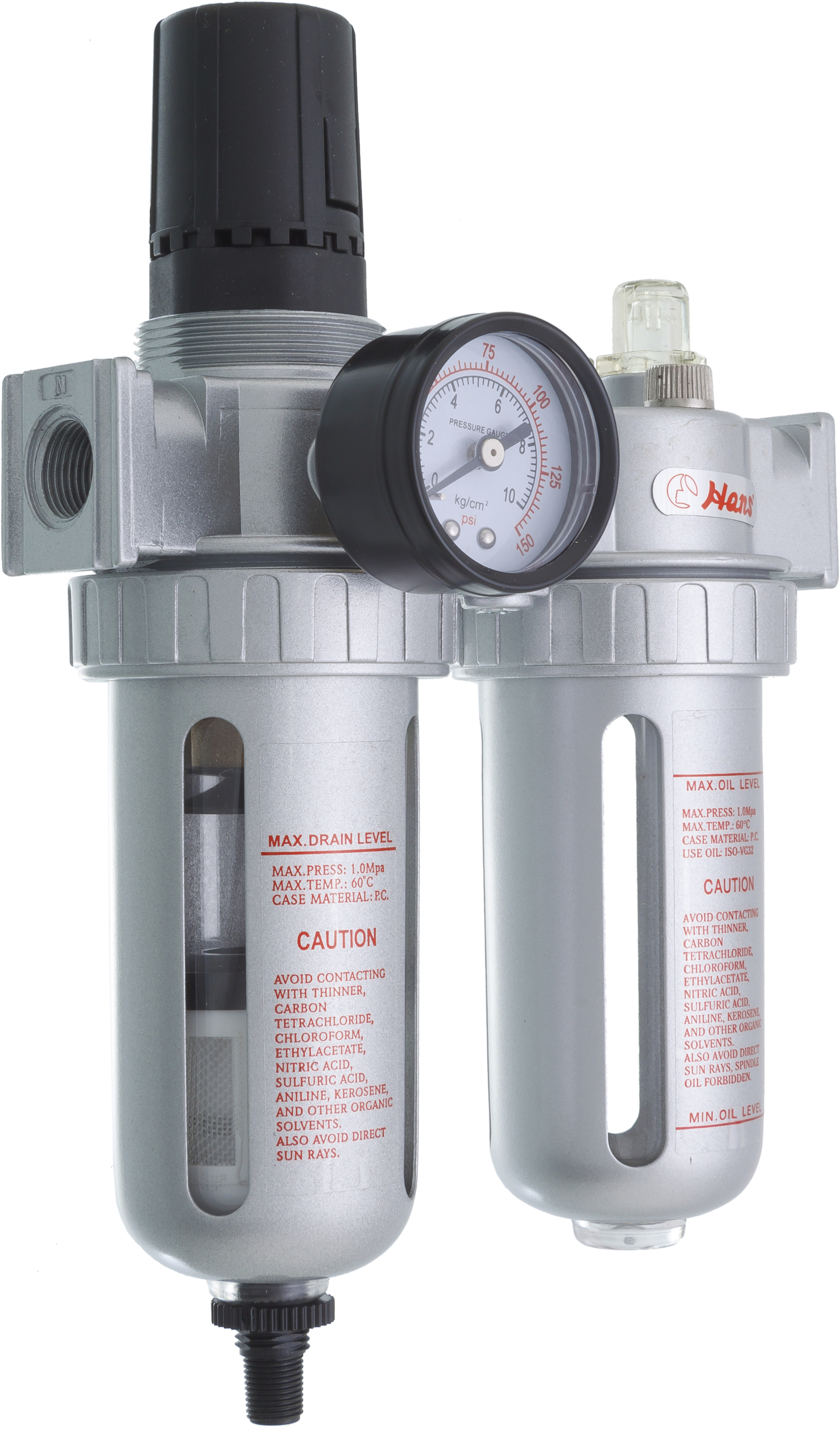 Посадочный квадрат - 1/2" Рабочее давление, bar - 1,5-9,0 MAX давление, bar - 10,0 Объем колбы регулятора, см3 - 40 Объем колбы лубрикатора, см3 - 75 Пропускная способность, Lmin - 3000 Вес, г - 1750 *Быстрая и надежная фиксация для удобства установки и использования *Высокая точность и надежность контроля регулировки давления *Эффективная очистка от влаги и твердых частиц *Лубрикатор продлевает срок службы пневмодвигателя почти в три раза *Корпус из алюминиевого сплава *Комплектуются латунными фитингами