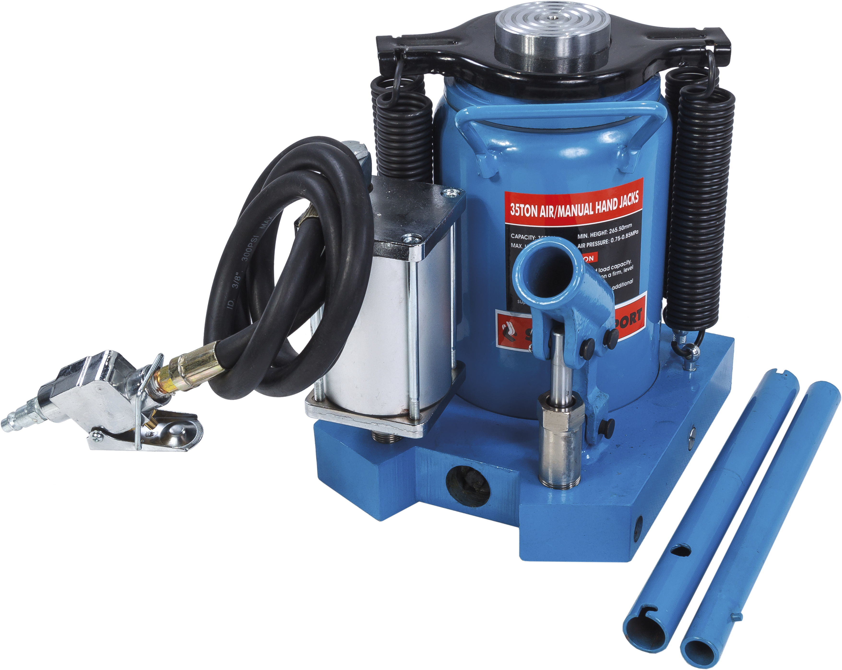 SD2003 бутылочный пневмо-гидравлический домкрат на 35 тонн Преимущества: • Отличная устойчивость за счет площади опоры • В комплекте рукав высокого давления с разъемом для подключения к сети сжатого воздуха • Дополнительный ручной привод • Компактность • Для удобства переноски домкрат оснащен ручкой • Долговечная порошковая окраска Характеристики: Грузоподъемность: 35 тонн Минимальная высота подхвата: 264 мм Максимальная высота подъема: 414 мм Требуемое давление воздуха: 0,75-0,85 МПа Бренд: СТАНКОИМПОРТ Цвет: синий Вес: 30 кг Гарантия: 1 год Упаковочные размеры: 1 место: 270х230х310 мм (картонная коробка)