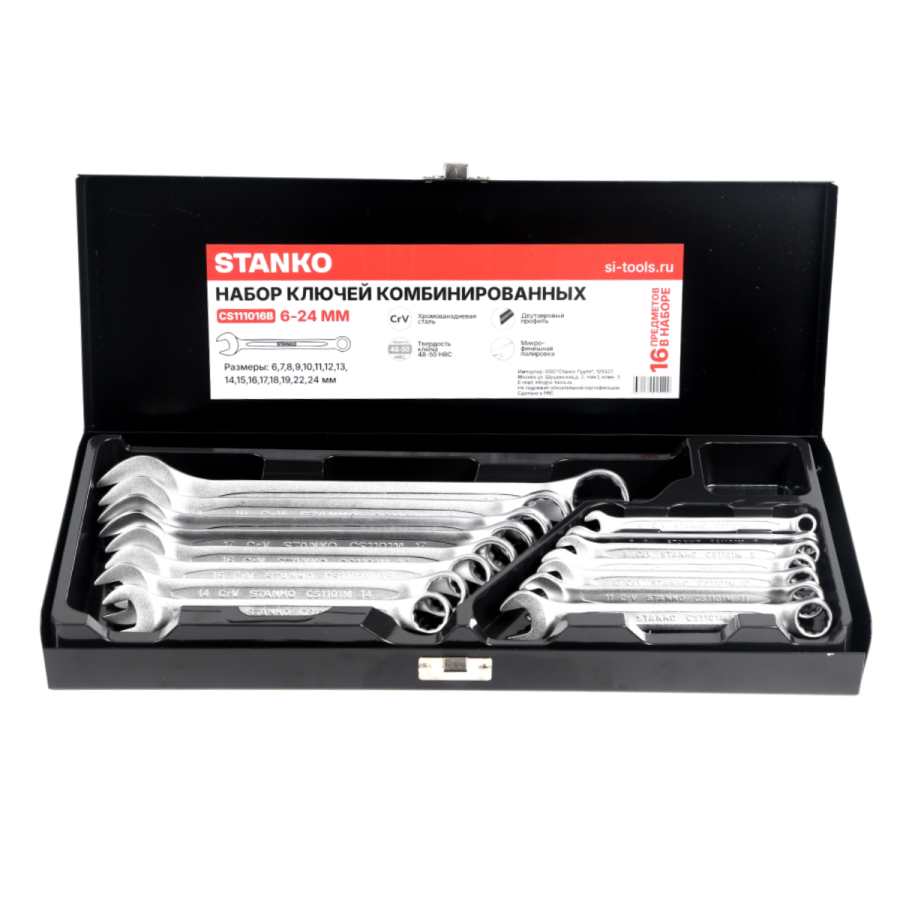 Набор включает в себя комбинированные ключи:6 мм, 7 мм, 8 мм, 9 мм, 10 мм, 12мм, 13мм, 14 мм, 15 мм, 16 мм, 17 мм, 18 мм, 19 мм, 22 мм, 24 мм.