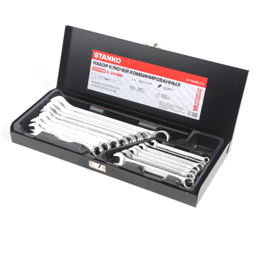 body{margin:0;padding:8px;} p{line-height:1.15;margin:0;white-space:pre-wrap;} ol,ul{margin-top:0;margin-bottom:0;} img{border:none;} li>p{display:inline;} Описание Комбинированный гаечный ключ представляет собой конструкцию, объединяющую рожковый и накидной профили. Назначение Данный вид инструмента применяется для выполнения любых видов работ с крепежом - как дома, в гараже, в авто-слесарной мастерской, станции технического обслуживания авто, мото и другой техники, так и на производстве. Особенности Финишная обработка Satint и хром никелевое покрытие комбинированного ключа обеспечивает надежную защиту от коррозии, а также надежный хват и препятствует выскальзыванию инструмента из рук. 12-гранный профиль накидной части подходит к головкам болтов и гайкам как 6-, так и 12-гранного профиля, и обеспечивает 5 градусный шаг перехвата. Специальный отгиб, в 15 градусов накидной части ключа позволит работать в местах с ограниченным доступом к крепежу и помогут подобраться к крепежу как с торца, так и с боку, в зависимости от места выполняемых работ. Ключи размещены в удобном металлическом кейсе с ПВХ ложементом, что обеспечивает простоту подбора необходимого ключа.В случае необходимости ложемеент можно извлечь из кейса разместить в полке инструментальной тележки. Качество Ключи изготовлены из высококачественной инструментальной легированной хром-ванадиевой стали. Технология горячей ковки и термической обработки ключей придаёт им особую прочность и высокую надёжность - все те качества, которые соответствуют требованиям стандартов DIN 3113, ISO 7738. Состав набора Набор включает в себя комбинированные ключи:6 мм, 7 мм, 8 мм, 9 мм, 10 мм, 11мм, 12мм, 13мм, 14 мм, 15 мм, 16 мм, 17 мм, 18 мм, 19 мм, 22 мм, 24 мм. Гарантия На ключи бренда STANKO распространяется пожизненная гарантия.