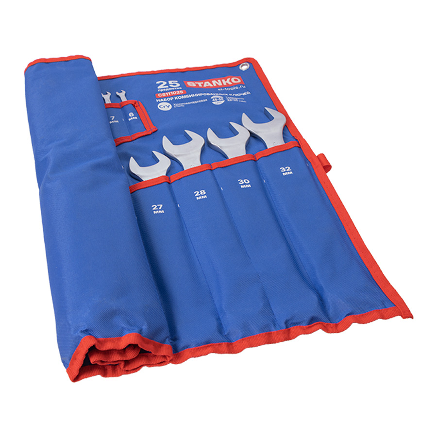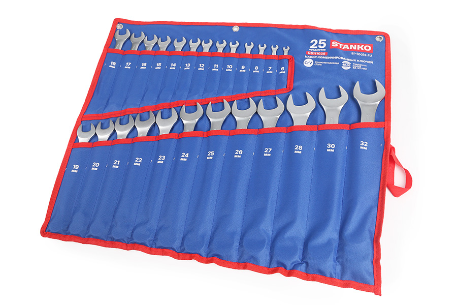 body{margin:0;padding:8px;} p{line-height:1.15;margin:0;white-space:pre-wrap;} ol,ul{margin-top:0;margin-bottom:0;} img{border:none;} li>p{display:inline;} Описание Комбинированный гаечный ключ представляет собой конструкцию, объединяющую рожковый и накидной профили. Назначение Данный вид инструмента применяется для выполнения любых видов работ с крепежом - как дома, в гараже, в авто-слесарной мастерской, станции технического обслуживания авто, мото и другой техники, так и на производстве. Особенности Финишная обработка Satint и хром никелевое покрытие комбинированного ключа обеспечивает надежную защиту от коррозии, а также надежный хват и препятствует выскальзыванию инструмента из рук. 12-гранный профиль накидной части подходит к головкам болтов и гайкам как 6-, так и 12-гранного профиля, и обеспечивает 5 градусный шаг перехвата. Специальный отгиб, в 15 градусов накидной части ключа позволит работать в местах с ограниченным доступом к крепежу и помогут подобраться к крепежу как с торца, так и с боку, в зависимости от места выполняемых работ. Ключи размещены в удобном чехле из ПВХ ткани оксфорд плотностью 800 гр/м, размер в раскрытом виде 600х520х15 мм, каждое место размещения инструмента промаркировано, что обеспечивает простоту подбора необходимого ключа. Качество Ключи изготовлены из высококачественной инструментальной легированной хром-ванадиевой стали. Технология горячей ковки и термической обработки ключей придаёт им особую прочность и высокую надёжность - все те качества, которые соответствуют требованиям стандартов DIN 3113, ISO 7738. Состав набора Набор включает в себя комбинированные ключи:6 мм, 7 мм, 8 мм, 9 мм, 10 мм, 11 мм, 12мм, 13мм, 14 мм, 15 мм, 16 мм, 17 мм, 18 мм, 19 мм, 20 мм. 21 мм, 22 мм, 23 мм. 24 мм, 25 мм, 26 мм, 27 мм, 28 мм, 30 мм, 32 мм. Гарантия На ключи бренда STANKO распространяется пожизненная гарантия.