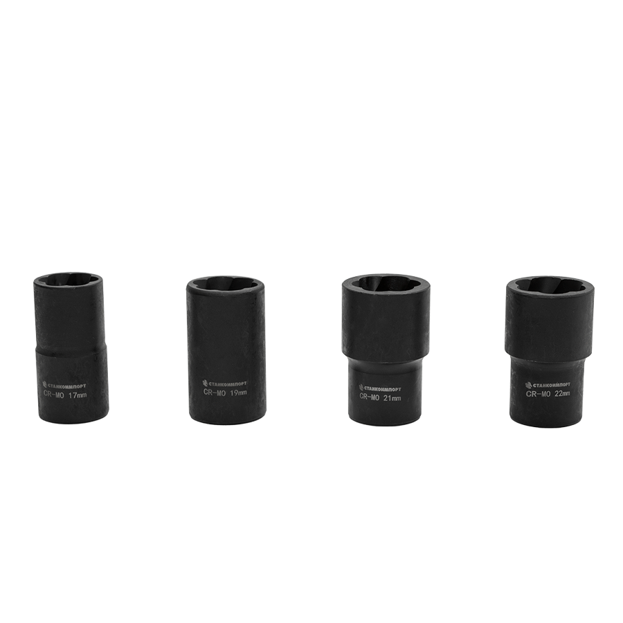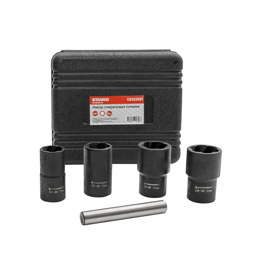 Набор предназначен для демонтажа поврежденного крепежа. Комплектация Спиральные головки L = 50 мм 17 мм, 19 мм, 21 мм, 22 мм.; Выколотка; Пластиковый кейс.