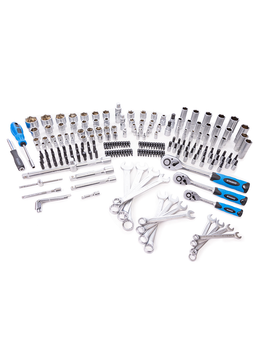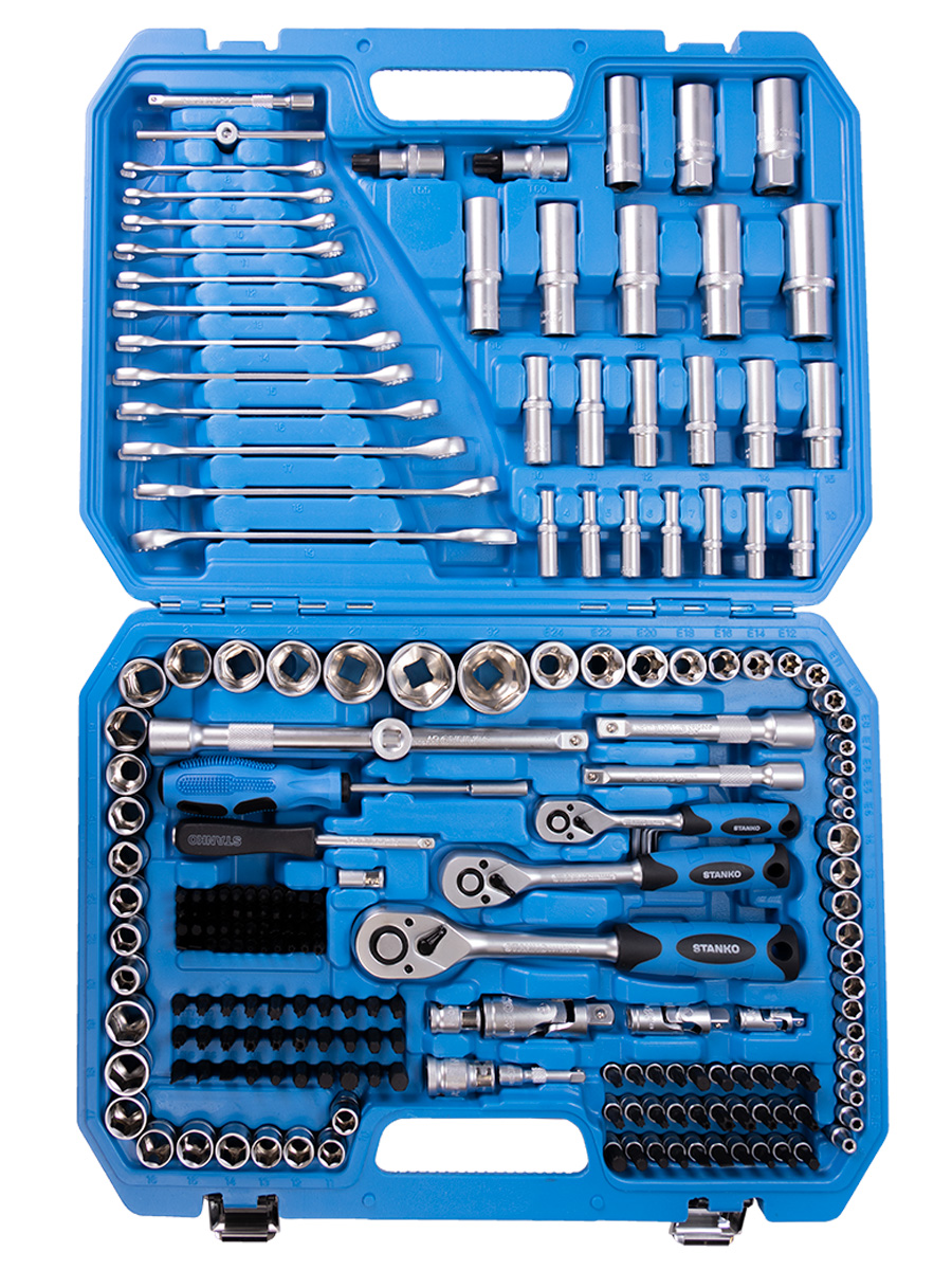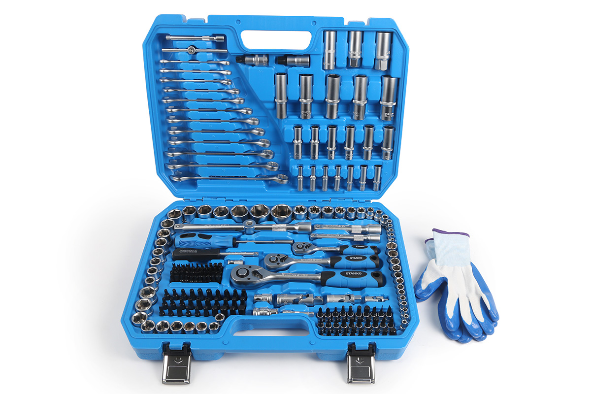 Назначение: Универсальный набор инструментов 216 предметов от бренда STANKO в первую очередь предназначен для монтажных, демонтажных и ремонтных работ. Может применяться как в автосервисах, мастерских и СТО, так и в гараже или дома для бытового использования. Описание: Инструменты из данного набора отличаются износостойкостью: биты изготовлены из высококачественной инструментальной стали S2, а остальные предметы из прочной хромованадиевой стали. Рациональное размещение инструментов в кейсе обеспечивает удобство транспортировки и облегчает поиск необходимого инструмента. Сами инструменты расположены в индивидуальных подписанных ячейках, снабженных фиксаторами. Отвертки, торцевые головки и биты основных типоразмеров выручат в разных ситуациях. Трещоточные ключи имеют механизм 72 зуба с шагом 5° и помогут раскрутить гайки в труднодоступных местах. Карданы и удлинители нужны для еще более эффективного решения задач. Особенности: Анатомическая, двухкомпонентная рукоятка трещотки изготовлена из маслобензостойкого материала, что обеспечивает комфорт в работе. Внутри механизма трещотки установлена специальная плоская пружина, которая исключает люфты. Трещотка имеет металлический флажковый переключатель. Свечные головки снабжены магнитным фиксатором, посаженным через латунное кольцо. Головки снабжены специальными фрикционными насечками, предотвращающими выскальзывание из рук. Весь инструмент имеет хром-никелевое покрытие. В подарок к каждому набору кладем рабочие перчатки универсального размера. Комплектация: НаименованиеОписание торцевые головки 1/4"4, 4.5, 5, 5.5, 6-14 мм торцевые головки длинные 1/4"4-10 мм торцевые головки E-Star 1/4"Е4, Е5, Е6, Е7, Е8 ключ трещоточный с быстрым сбросом 1/4" 72 зуба отверточная рукоятка 1/4"150 мм вороток Т-образный 1/4"110 мм удлинители 1/4"50, 100 мм кардан шарнирный 1/4"40 мм торцевые головки со вставкой 1/4": - шестигранные HEX3, 4, 5, 6 мм - шлицевые SlotSL4, SL5.5, SL6.5, SL7 - крестовые PhilipsPH0, PH1, PH2 - крестовые PozidrivPZ0, PZ1, PZ2 - TorxТ8, Т9, T10, T15, T20, T25, T27, T30 - Torx BOТH8, ТH9, TH10, TH15, TH20, TH25, TH27, TH30 битодержатель 1/4"х 1/4"25 мм отвертка для бит с магнитом 1/4"200 мм биты 1/4": - шестигранные HEX BO2, 2.5, 3, 4, 5, 6 мм - TorxТ5, T6 - Torx BOTH7 - KeywayM5, M6, M7, M8, M9 ...