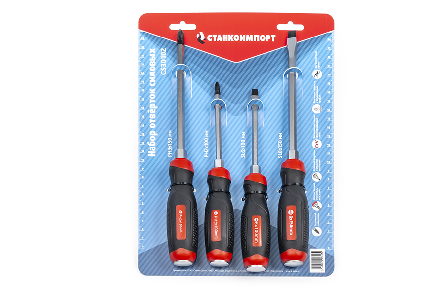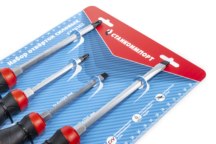 body{margin:0;padding:8px;} p{line-height:1.15;margin:0;white-space:pre-wrap;} ol,ul{margin-top:0;margin-bottom:0;} img{border:none;} li>p{display:inline;} Назначение Набор силовых отверток 4 предмета предназначен для завинчивания/отвинчивания крепежных элементов вручную, имеющих внутренний рабочий профиль. Применение На станциях технического обслуживания автомобилей, в автосервисах и автомастерских, для домашнего использования или профессиональных ремонтно-монтажных работ. Особенности Набор отверток 4 предмета изготовлен из высококачественной легированной хром-ванадиевой инструментальной стали, с последующей закалкой до твердости в пределах 46-48HRC, что соответствует всем требования нормативной документации. Наконечник проходят дополнительную термическую обработку с целью получения оптимального сочетания твердости и пластичности. Стержень имеет глубокую посадку с крепление в двух точках, что исключает проворачивание стержня в рукояти. Отвертка снабжена двухкомпонентной эргономичной рукоятью. Благодаря высококачественным компонентам рукоять имеют высокую стойкость к агрессивным средам. Качество Защиту от коррозии обеспечивает специальное хром-никелевое покрытие. Гарантия На отвертки бренда СТАНКОИМПОРТ распространяется гарантия 12 месяцев.
