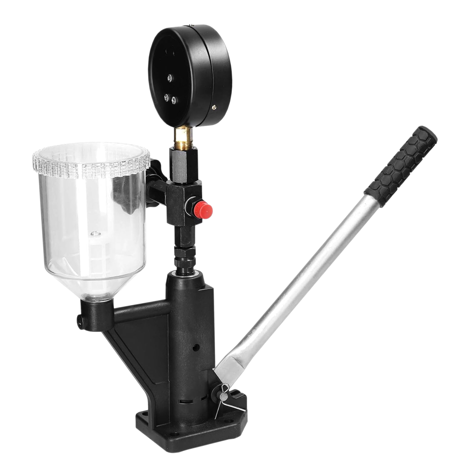 Прибор представляет собой емкость с фильтром для залива жидкости, ручной насос со способностью нагнетания давления до 40 Мпа с регулировочным клапаном и массивный манометр для определения показателей компрессии.