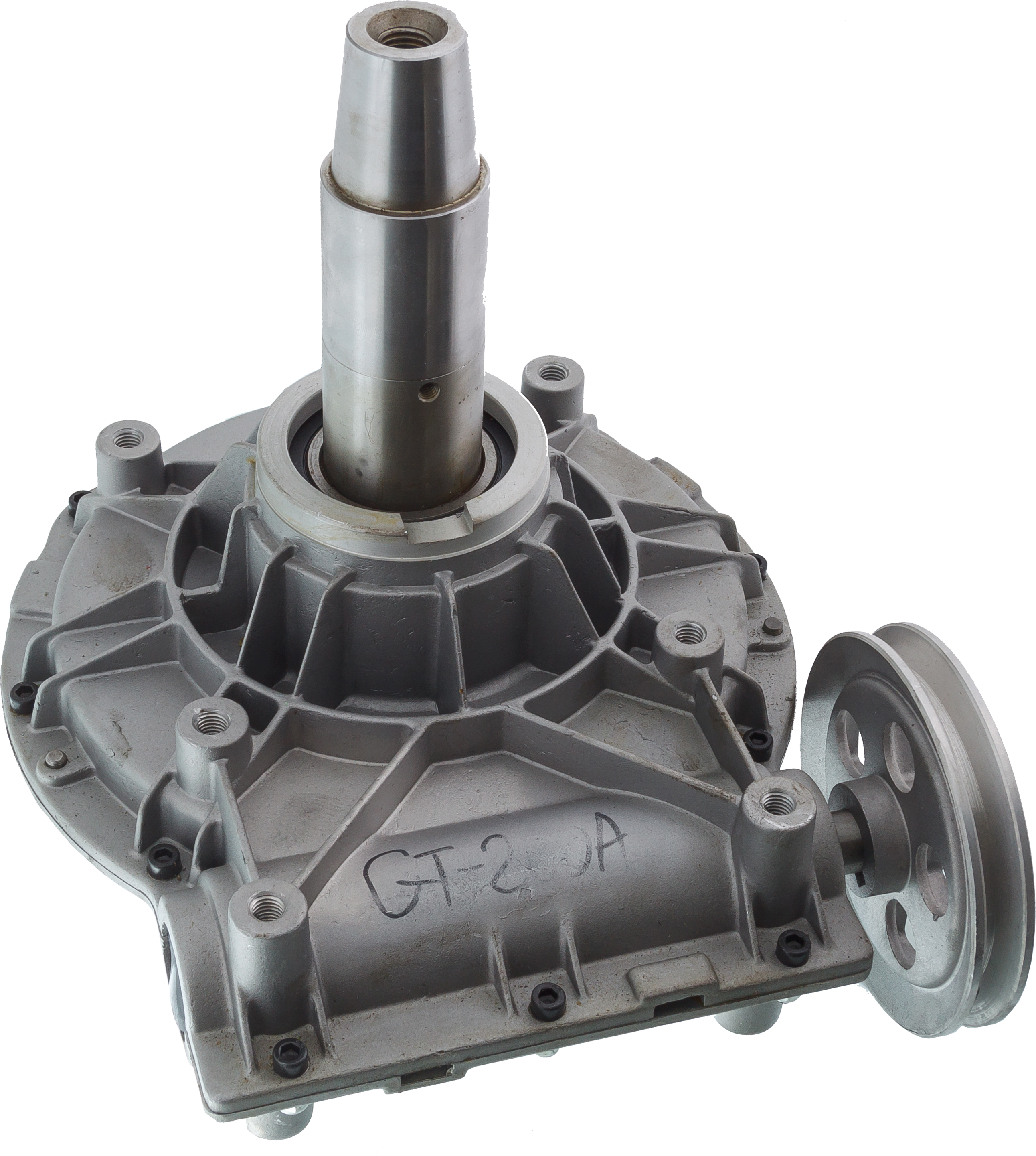Редуктор в сборе. Угловой червячный редуктор, понижающий скорость вращения вала двигателя, приводится в действие электродвигателем с ременной передачей. Применяется в составе узла поворотного стола.