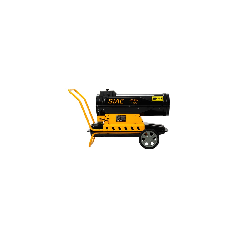 SIAL Y20 — тепловая пушка прямого нагрева мощностью 20 кВт. Модификация на колесах со встроенным топливным баком на 25 литров солярки. Производительность прогрева воздушных масс до 800 куб. м в час. Теплогенератор оптимален для локаций площадью 150–250 м². На корпусе смонтирован термостат с цифровыми дисплеями и механическим регулятором, что позволяет выставлять температуру при которой устройство будет само включаться и выключаться. Использование термостата позволяет более эффективно применять систему, а также снижать эксплуатационные расходы на горючее. В конструкции тепловой пушки применяется надежная электронная плата управления, которая позволяет фиксировать наличие пламени, отключать активную фазу горения при перегреве, управлять фазами старта и остановки при активации значений термостатического блока.