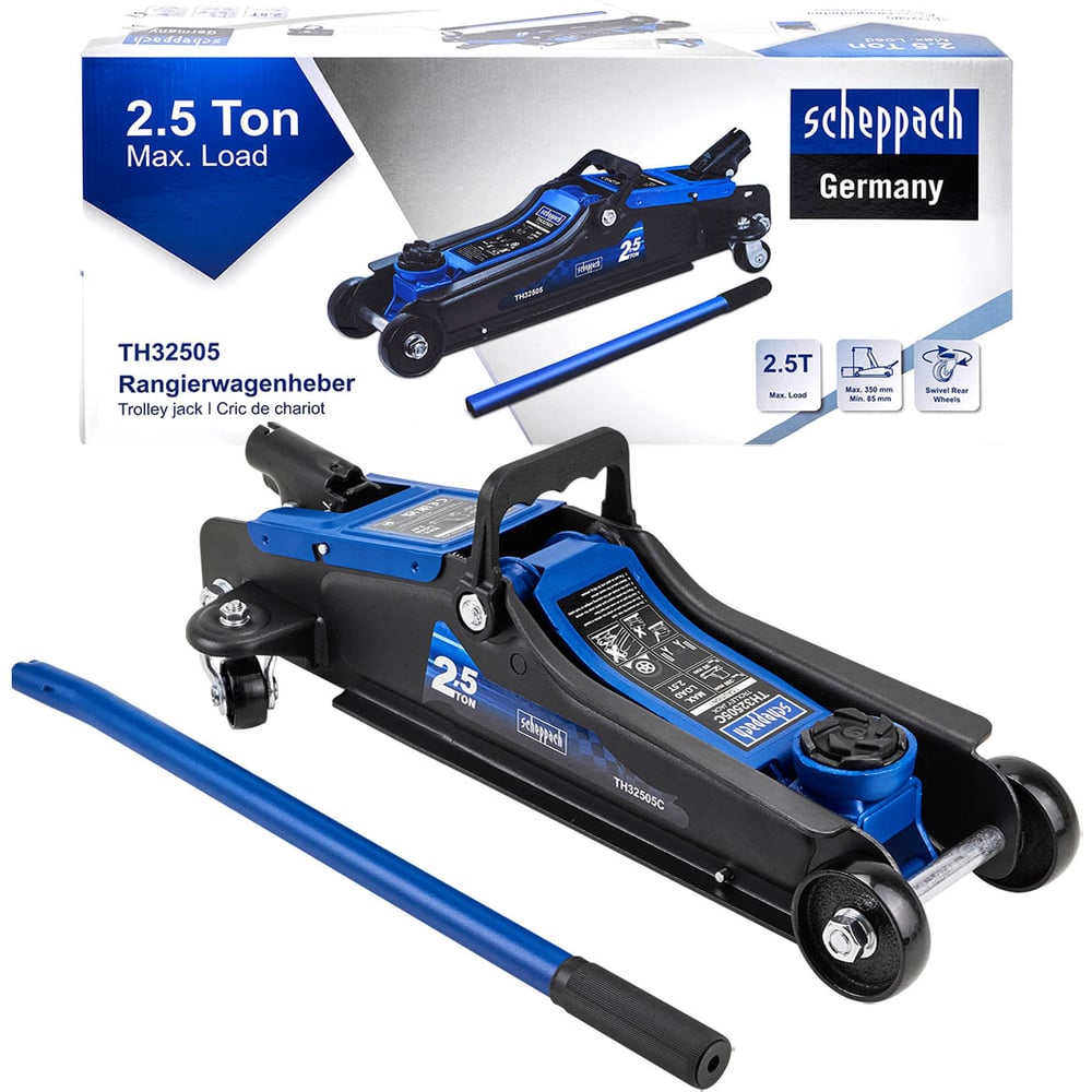 Автомобильный подкатной домкрат Scheppach 2,5 т — это надежное и профессиональное оборудование, предназначенное для подъема транспортных средств при ремонте, обслуживании или замене шин. Благодаря прочной конструкции и продуманным деталям, он идеально подходит для автосервисов, шиномонтажных мастерских и домашнего гаража. Особенно эффективен при работе с автомобилями с низким клиренсом.Ключевые особенности:Грузоподъемность 2,5 тонны Позволяет безопасно поднимать легковые и некоторые коммерческие автомобили.Минимальная высота подхвата — 85 мм Идеален для машин с низкой посадкой, включая спортивные и городские авто.Максимальная высота подъема — 350 мм Обеспечивает комфортный доступ к днищу автомобиля для проведения работ.Предохранительный и спускной клапан Защищает от перегрузки и позволяет плавно опускать автомобиль без рывков.Возвратная пружина Автоматически возвращает механизм в исходное положение — удобно и быстро.Резиновая накладка в комплекте Предотвращает повреждение кузова и обеспечивает надежное сцепление с точкой подъема.Маневренные колеса (2 поворотных + 2 фиксированных) Обеспечивают устойчивость и легкость перемещения по рабочей зоне.Гидравлическое масло с температурным диапазоном ±50 °C Надежная работа в условиях жары и холода — подходит для круглогодичного использования.Компактность и мобильность Легко транспортируется и хранится — идеален для выездных работ и ограниченного пространства.