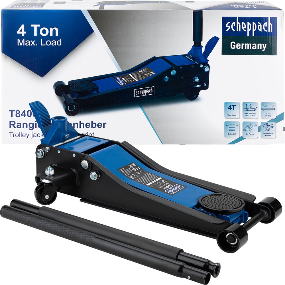 Домкрат подкатной гидравлический от бренда Scheppach - надёжный и мощный инструмент для подъёма автомобилей с низким клиренсом, идеально подходит для автосервисов, шиномонтажных мастерских и гаражного использования. Домкрат оснащён прочным стальным корпусом, двухпоршневым механизмом и продуманной системой безопасности, обеспечивая комфорт и эффективность при проведении ремонтных работ.Преимущества:Высокая грузоподъёмность. Поднимает до 4 тонн, что позволяет работать с легковыми и коммерческими автомобилями.Низкий профиль. Высота подхвата — 75 мм, подъём — до 505 мм, идеально подходит для автомобилей с низкой посадкой.Быстрый подъём. Двухпоршневая система и педаль для быстрого подъёма ускоряют работу и освобождают руки.Безопасность в приоритете. Оснащён предохранительным и спускным клапаном, предотвращающим перегрузку и обеспечивающим плавное опускание.Удобство в эксплуатации. Две возвратные пружины автоматически возвращают механизм в исходное положение.Манёвренность и устойчивость. Домкрат имеет 2 поворотных колеса на 360° и 2 фиксированных, обеспечивая лёгкое перемещение и стабильность.Практичные детали. Встроенный лоток для болтов и резиновая накладка защищают автомобиль и упрощают работу.Надёжность в любых условиях. Гидравлическое масло работает в диапазоне температур от -50°C до +50°C, обеспечивая стабильную работу круглый год.Комплектация. Включает домкрат, рукоять и резиновую накладку. Поставляется в двух коробках для удобства транспортировки.