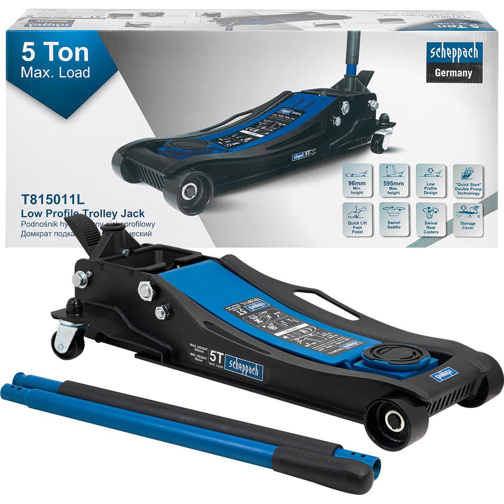 Подкатной домкрат Scheppach — это высококачественное и надежное оборудование, предназначенное для подъема автомобилей в автосервисах, шиномонтажных центрах и гаражах. Он идеально подходит для автомобилей с низким клиренсом, обеспечивая удобство и безопасность при работе.Характеристики:Грузоподъемность: 5 тоннМаксимальный уровень подъема: 595 ммМинимальная высота подхвата: 96 ммТип: двухпоршневой (ускоренный подъем)Колеса: 2 поворотных на 360° для маневренности и 2 фиксированных для устойчивостиДополнительно: встроенный лоток для колесных болтов, складная рукоять с мягким покрытием, резиновая накладка для защиты кузоваВысокая грузоподъемность (5 тонн) — подходит для большинства легковых и грузовых автомобилей.Низкий минимальный подхват (96 мм) — идеален для авто с низким клиренсом.Двухпоршневой механизм — обеспечивает быстрый подъем без лишних усилий.Предохранительный и спускной клапаны — защищают от перегрузок и позволяют плавно опускать домкрат.Удобство использования — складная рукоять с мягким покрытием и встроенный лоток для мелких деталей.Маневренность и устойчивость — благодаря 4 колесам, два из которых поворотные.Прочная резиновая накладка — защищает кузов автомобиля от повреждений при подъеме.Домкрат Scheppach — это прочный, надежный и удобный инструмент для безопасного и быстрого подъема автомобиля во время ремонта или технического обслуживания. Отличный выбор как для профессионального автосервиса, так и для личного гаража.
