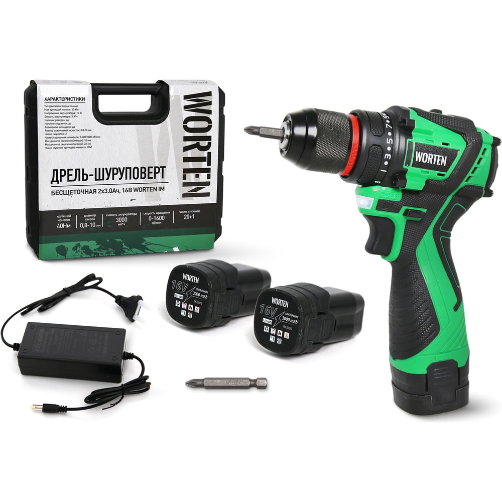 Дрель-шуруповерт бесщеточная WORTEN 2x3.0Ач, 16В IM КА-90000576