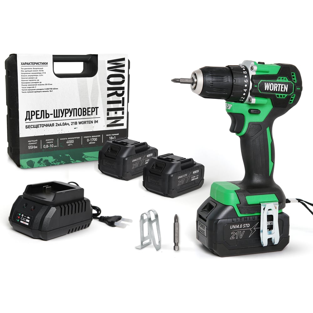 Дрель-шуруповерт бесщеточная WORTEN 2x4.0Ач, 21В IM КА-90000575