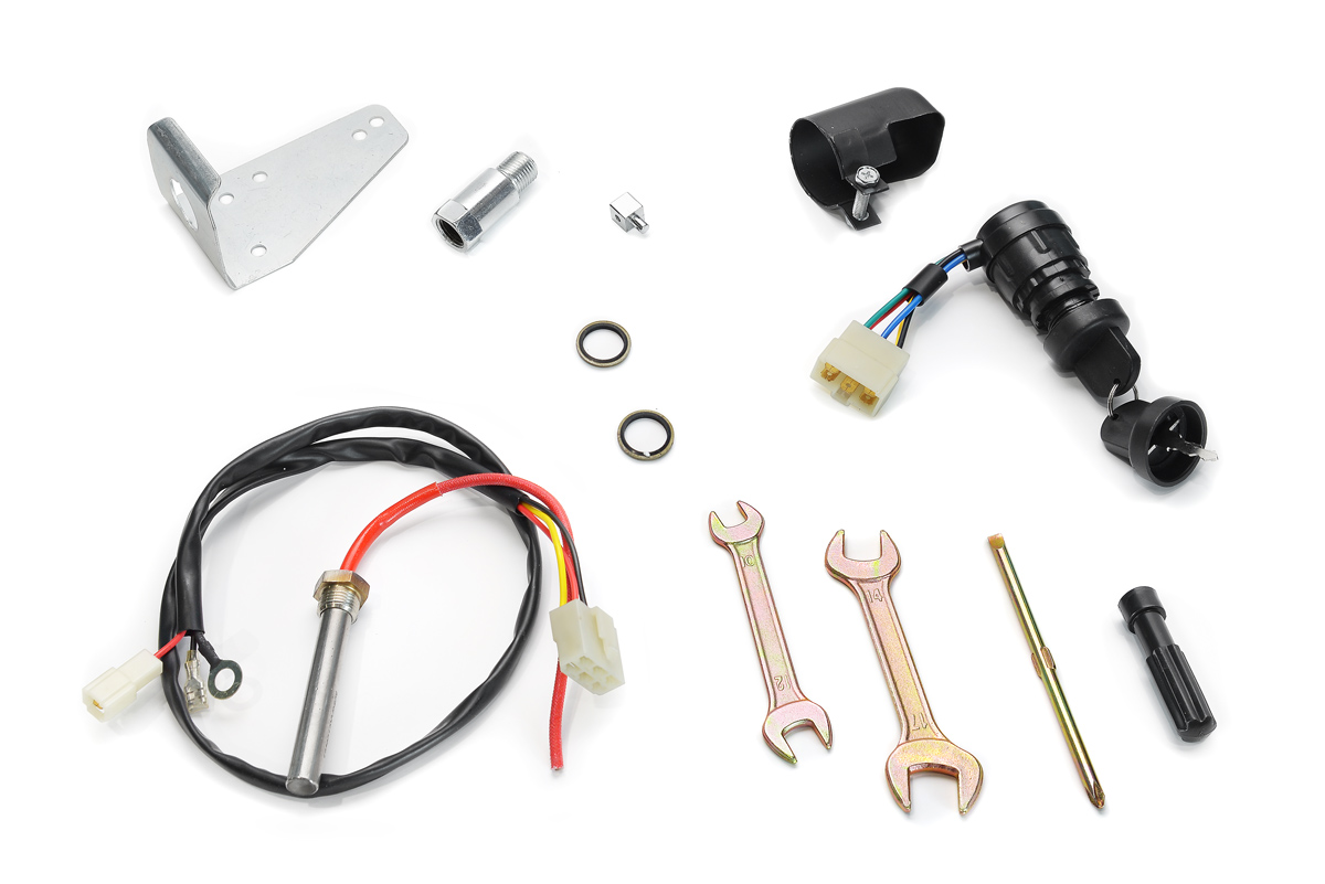 Стартеры ручной и электрический, бак топливный, глушитель.