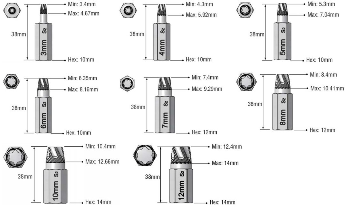 Экстракторы Torx, набор 8 предметов. Применяются для извлечения обломанных болтов Torx, Torx plus, Torx Security. Размеры: 3, 4, 5, 6, 7, 8, 10, 12 мм. Материал: S2, твердость: HRC 58-60.