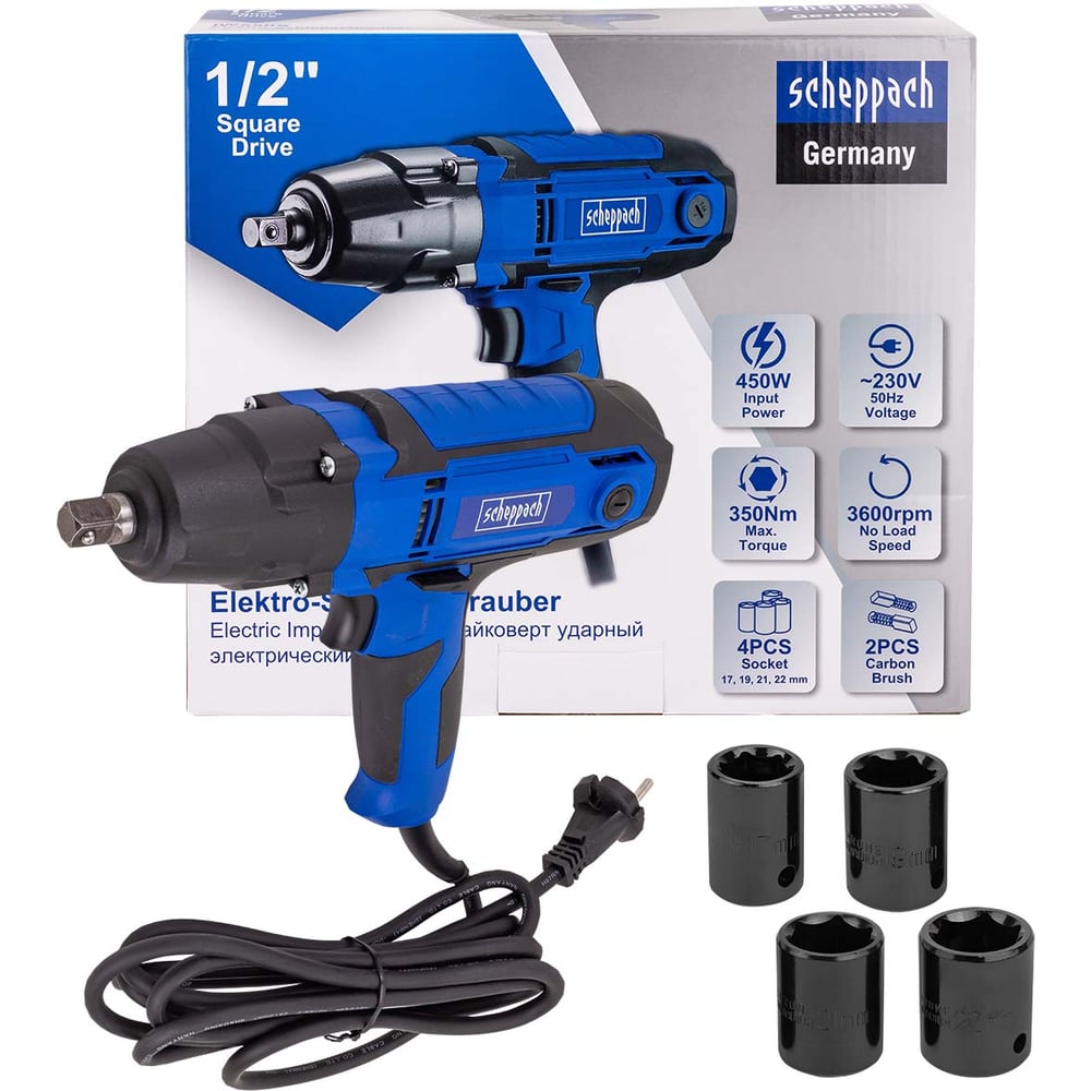 Электрический ударный гайковерт от бренда Scheppach — это надёжный инструмент для работы с крепежом, предназначенный как для домашнего пользования, так и для полупрофессионального применения. Благодаря питанию от сети, он обеспечивает стабильную мощность 450 Вт, позволяя эффективно закручивать и откручивать гайки и болты. В комплект входят четыре сменные головки и запасные угольные щётки, что делает его готовым к работе сразу после распаковки.Мощный ударный механизм. Выдерживает высокие нагрузки, обеспечивая крутящий момент до 350 Н·м — идеально для сложных крепёжных соединений.Посадка инструмента 1/2" с подпружиненным шариком. Надёжная фиксация насадок — быстросменные головки держатся плотно и не выскакивают в процессе работы, повышая безопасность и удобство при использовании. Совместимость с широким спектром стандартных принадлежностей делает инструмент универсальным помощником в гараже и на стройке.Постоянная мощность от сети. Не зависит от заряда аккумулятора — можно работать сколько угодно долго без перерывов.Полная комплектация. В наборе: 4 головки (17, 19, 21, 22 мм), 2 угольные щетки.Прочный корпус. Изготовлен из качественных материалов, устойчивых к механическим повреждениям и износу.Эргономичная прорезиненная рукоятка. Удобно лежит в руке, снижает усталость при длительной работе и обеспечивает безопасный хват.Функция реверса. Быстрое переключение направления вращения для откручивания и закручивания — универсальность при работе.