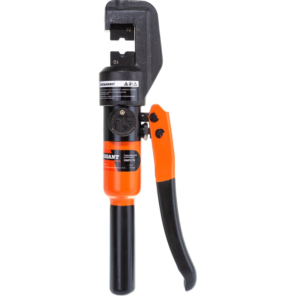 Гидравлический ручной пресс Gigant HMPJ-70 предназначен для опрессовывания силовых медных, алюминиевых и алюмомедных наконечников и гильз на провод и кабель с медными и алюминиевыми жилами. Рабочая часть пресса имеет высокий запас прочности - полностью выполнена из закаленного металла. Сменные матрицы устанавливаются в посадочные отверстия в верхней части рабочей головы и штоке. Матрицы в комплекте инструмента позволяют использовать их к арматуре распространенных стандартов: ГОСТ, DIN и др. Количество матриц - 9 (4,6,8,10,16,25,35,50,70 мм.кв.). Профиль обжима - гексагональный. Диапазон рабочих температур -15 +40 С.