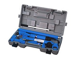 Набор аксессуаров для кузовного ремонта, включая гидроцилиндр и ручной насос.