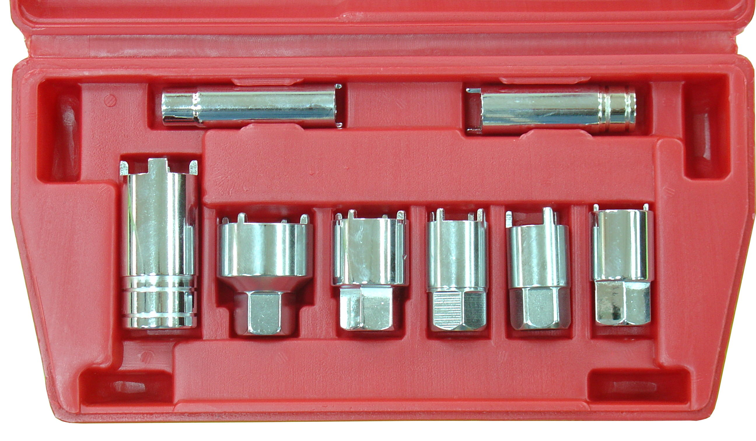 KA-8201 Набор из 8 корончатых головок Предназначение KA-8207 Для шаровых шарниров. Для использования на 4-5-осных грузовиках, таких как Dodge, Ford, Chevrolet, GMC и международных грузовых автомобилях с приводом на 4 колеса. Регулирует втулку в верхней части зажима на передней подвеске. Посадочный квадрат 1/2”, внешний диаметр 25 мм, длина 53 мм. KA-8208 Для антенных гнезд с резьбой. Двух корончатая головка с внешним шестигранником 11/16”. Хромоникелевая обработка. Используется в автомобилях Ford Probe 1989-1990, Mazda RX7 1989-1990 и 926 Nissan Stanza и Maxima. KA-8204 Для антенных гнезд с резьбой. Четырех корончатая головка с внешним шестигранником 11/16”. Хромоникелевая обработка. Используется в автомобилях GM Cavalier и Sunbird 1988-90, пикапы C/K на платформе GMT400 1988-1990; Lincoln Town Car и Continental 1989-1990, Toyota Camry и Celica 1990, Mitsubishi Eclipse, Mitsubishi Galant и Sigma. KA-8210 Для гнезд подключения пульта управления зеркалами. Двух-корончатая головка посадочный квадрат 3/8”. Диаметр со стороны привода 15,5 мм; диаметр со стороны коронки 16 мм. Длина 54 мм. Хромоникелевая обработка. Используется во многих автомобилях Ford и VW. KA-8206 Для антенных гнезд с резьбой. Трех-корончатая головка с внешним шестигранником 11/16”. Диаметр 20 мм, длина 32 мм. Хромоникелевая обработка. Используется в автомобилях Chrysler 1987-настоящее время. KA-8203 Для антенных гнезд с резьбой. Четырех-корончатая головка с внешним шестигранником 11/16”. Хромоникелевая обработка. Используется в автомобилях Ford Taurus и Mercury Sable 1985-1990, Lincoln Mark VII 1990. KA-8205 Для гнезд с резьбой для антенны с электроприводом. Четырех-корончатая головка с внешним шестигранником 11/16”. Общая длина 44,5 мм. Хромоникелевая обработка. Используется в автомобилях GM 1977- настоящее время. KA-8209 Для гнезд с резьбой для панели радио. Посадочный квадрат 1/4”. Диаметр со стороны привода 13 мм; диаметр со стороны коронки 14 мм. Длина 58 мм. Хромоникелевая обработка. Используется в некоторых автомобилях GM и Ford.
