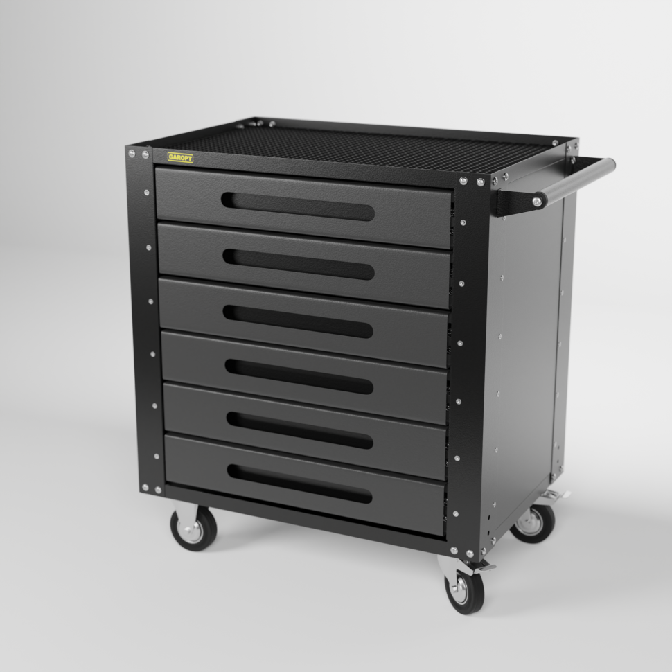 Бюджетная тележка с ящиками без замка GT. Изготавливается из металла толщиной 0,8мм. Тележка отличается низкой ценой. Оснащена колесами диаметром 100мм. Размеры ШхГхВ:810х490х810 мм. Размеры в упаковке: 735х500х700 мм., вес от 44,4 кг до 49,5 кг в зависимости от количества ящиков. Размер ящиков: низкие 447x565х80 мм, высокие 447x565х184 мм. Максимальная нагрузка на каждый ящик 30 кг. (продиктована максимальной нагрузкой на направляющие установленной производителем). Каждый высокий ящик ставятся на место 2х низких. Ручка может устанавливаться как на правую, так и на левую сторону. На противоположную сторону в установочные отверстия ручки можно крепить карман GTPPD6 (поставляется отдельно). В комплекте верхний коврик из EVO материала. Коврики в ящики поставляются как доп.опция. На боковых стенках расположены винтовые заклепки для крепления дополнительных навесок (карманы, держатели отверток). Покраска порошковым способом в один из стандартных цветов: желтый, серый, синий, красный, зеленый. По предварительной договоренности возможна покраска в нестандартные цвета выбранные заказчиком. Поставляется в коробке со снятыми колесами и ручкой. Для сборки достаточно крестовой отвертки. Опционально тележка может комплектоваться перфорированной панелью (экраном) GTPP720
