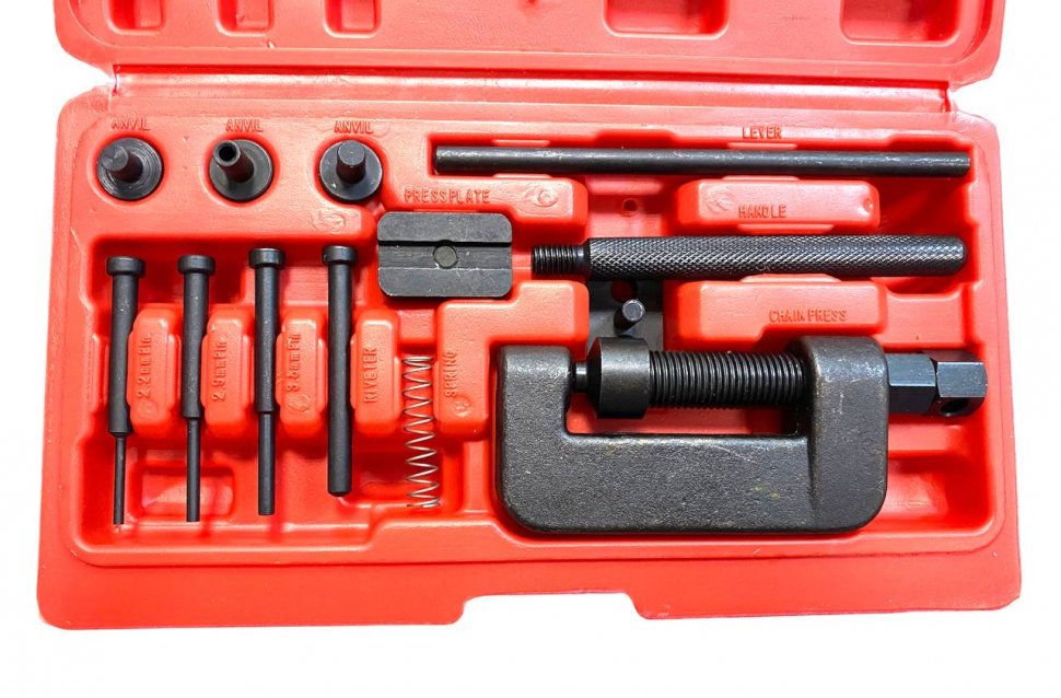 Набор инструмента в пластиковом кейсе для резки и расклепки цепей размерностей 420, 428, 520, 525 и 530, а так же цепей ГРМ. Идеальный вариант для компании мотоциклистов, которые все делают своими руками. Подходит для замков цепи, требующих развальцовывания.