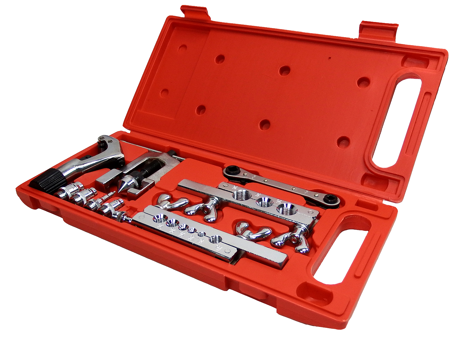 Инструмент для развальцовки труб TA-M1007 позволяет работать с изделиями из меди и латуни. Изготавливается из стали №45 высокой коррозионной стойкости. В наборе также адаптеры для формирования двойных раструбов.