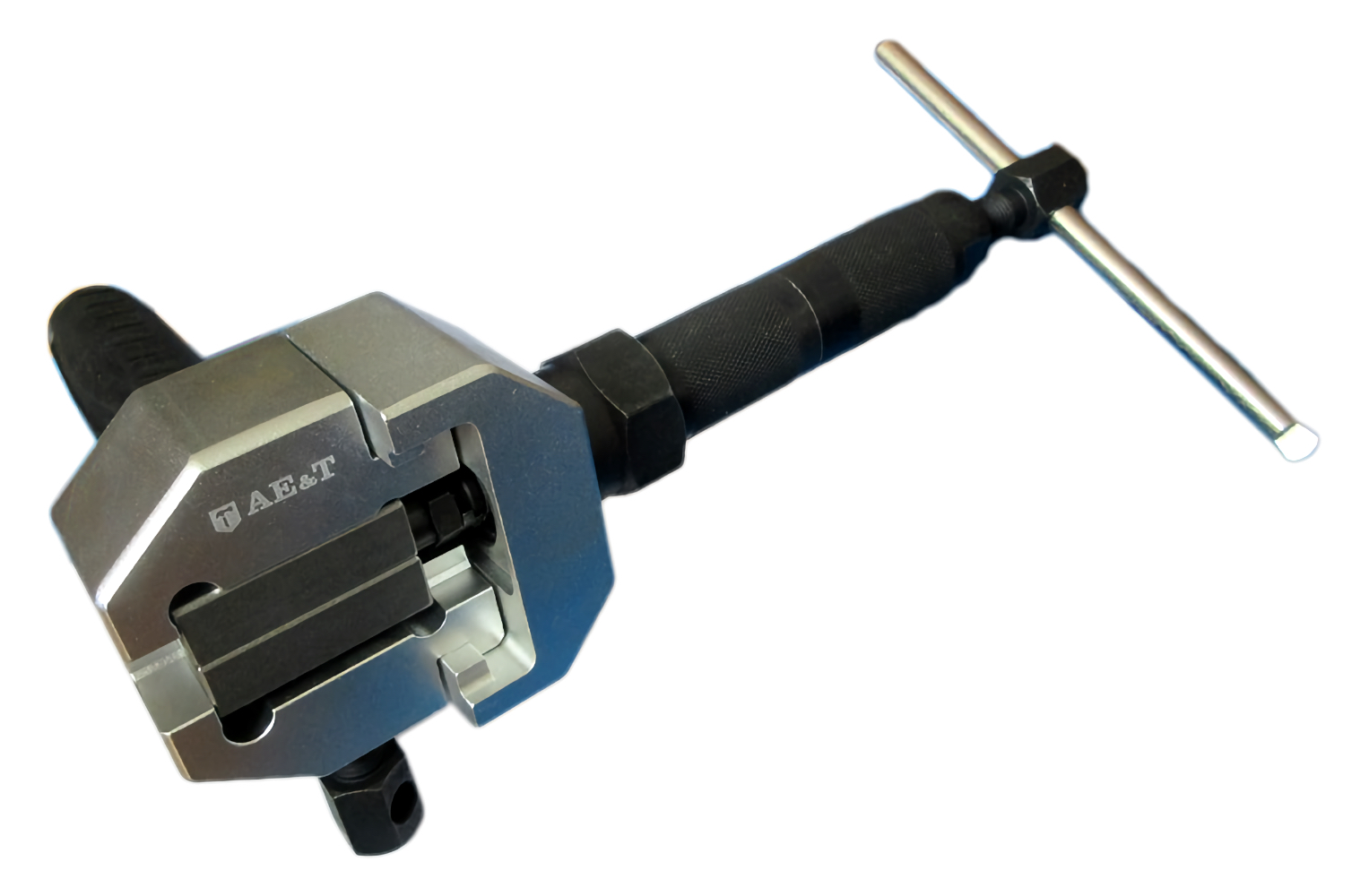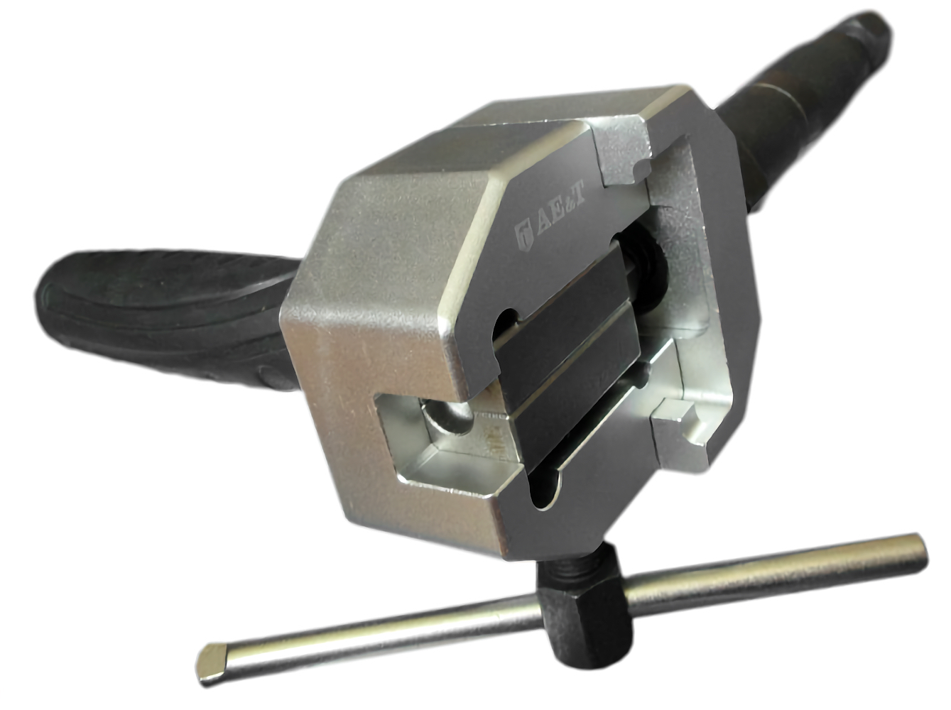 Прорезиненная рукоять. Винт (под вороток) для фиксации зажимов в корпусе для зажимов. Давящий цилиндр (под вороток). Вороток (150мм). Корпус для зажимов из двух половинок. Инструмент для снятия заусенцев и внутренней фаски