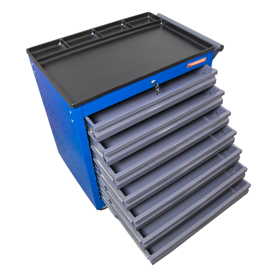 Закрытая инструментальная тележка на колесах с семью выдвижными ящиками помогает значительно сэкономить рабочее пространство в помещениях ремонтных учреждений за счет оптимизации хранения инструментов, крепежа и оборудования. Два из четырех колес тележки являются поворотными, одно из них также выполняет функцию фиксации: благодаря стопору оно не дает ей скатываться. Размер тележки составляет 562 х 395 х 795 мм. У нее семь ящиков, высота каждого из которых — 55 миллиметров, а грузоподъемность — 30 кг. Положительными отличиями тележки являются: Перфорация на боковых стенках В отверстия 8 мм можно подвесить крючки и навесные инструменты; Система фиксации Удерживает ящики в закрытом положении, предотвращает их произвольное открывание; Пластиковый лоток с ячейками на ее верхней поверхности В нем можно разместить компактные предметы; Центральный замок на ящиках Обеспечивает защиту их содержимого от посторонних; Ящики, выполненные из стали толщиной 0,8, а не 0,6 миллиметров, как у стандартных тележек Это существенно увеличивает ее ресурс; Усиленные крепления ручек и направляющие на зацепах Обеспечивают повышенную износостойкость. Важнейшим приоритетом для компании СТАНКОИМПОРТ является непревзойденно высокое качество нашей продукции. Приобретайте инструментальную тележку СТАНКОИМПОРТ и Вы убедитесь, что наше оборудование и инструменты сделаны с искренней заботой о тех, кто будет ими пользоваться!
