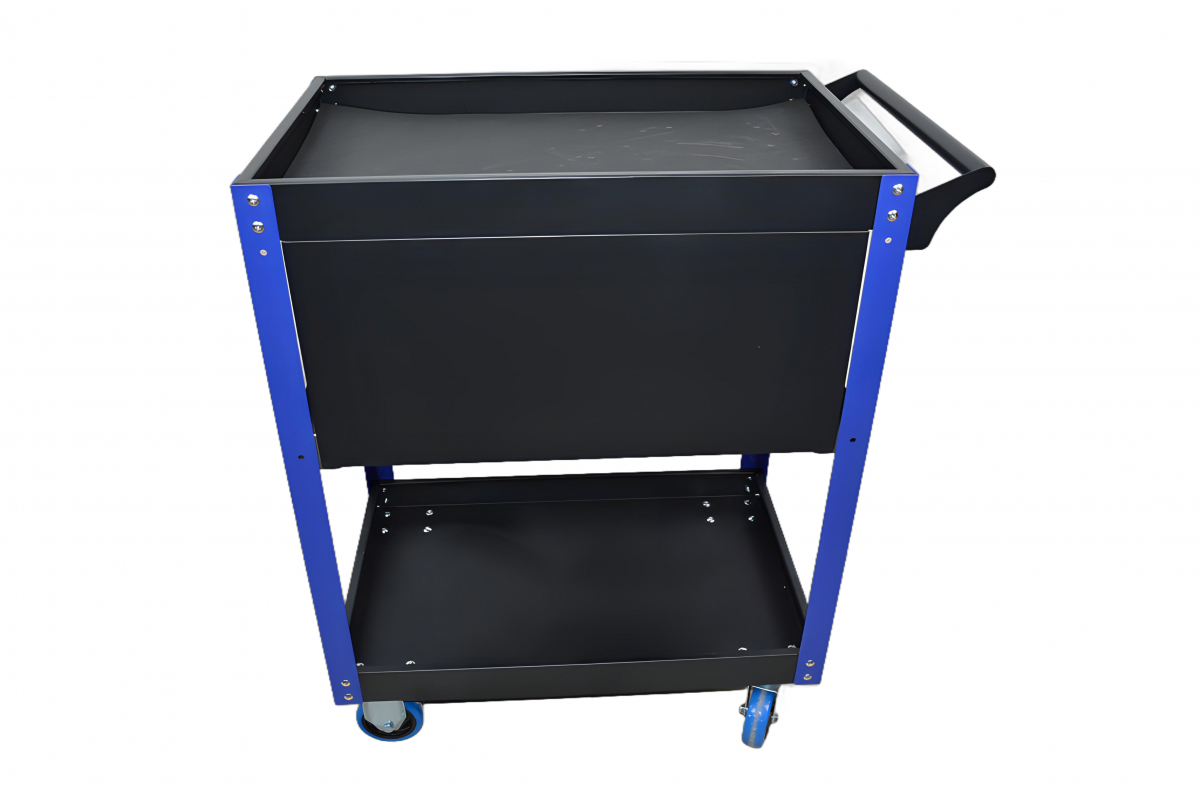 Для повышения мобильности и легкости перемещения, тележка оснащена двумя поворотными колесами с надежными креплениями. Благодаря этому, даже при полной загрузке, перемещать тележку по рабочей зоне не составит труда.