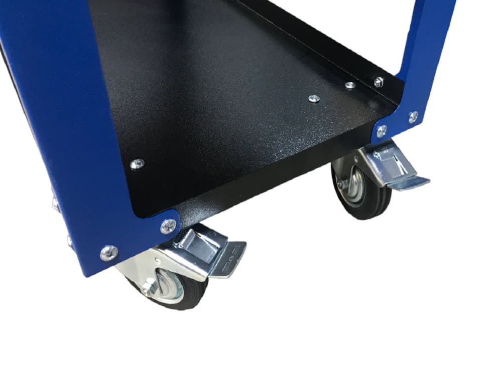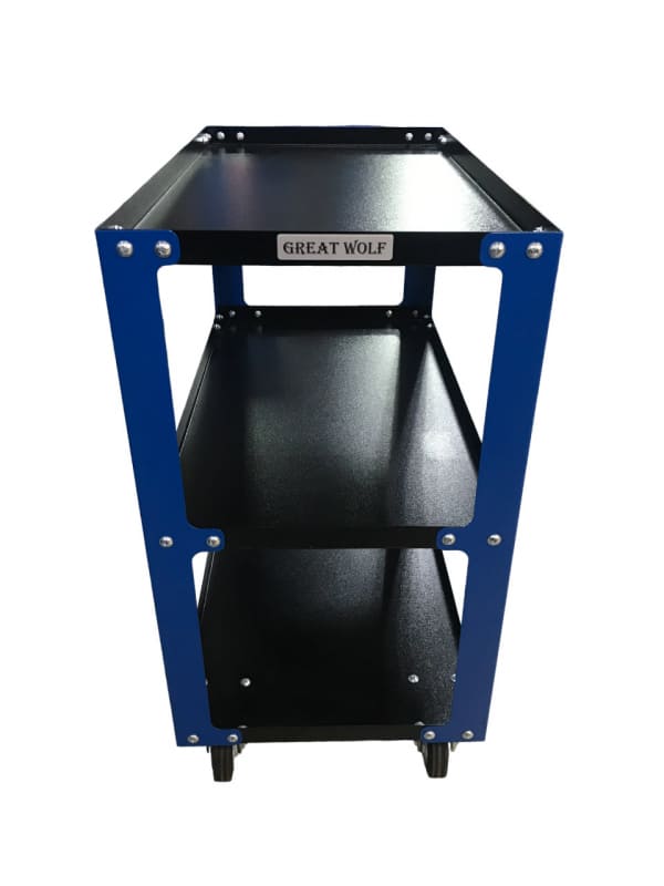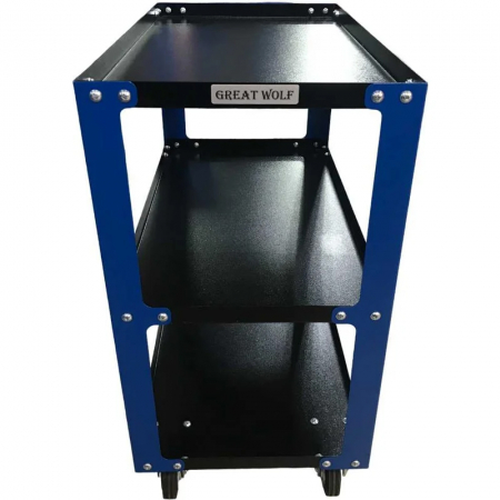 Инструментальная тележка Great Wolf GWT-B3 синего цвета открытая с тремя полками. Используется для хранения и транспортировки инструментов в автосервисах, гаражных мастерских, заводских и производственных цехах.