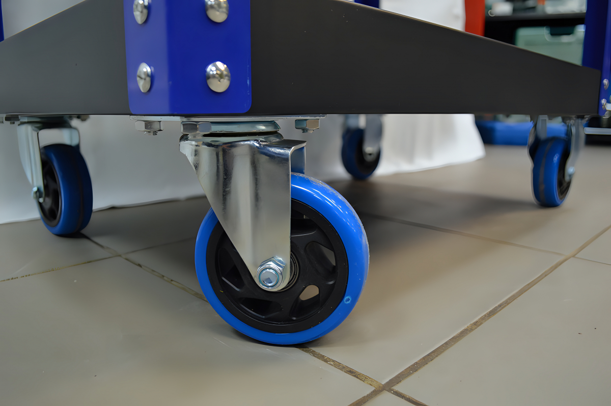 Для повышения мобильности и легкости перемещения, тележка оснащена двумя поворотными колесами с надежными креплениями. Благодаря этому, даже при полной загрузке, перемещать тележку по рабочей зоне не составит труда.