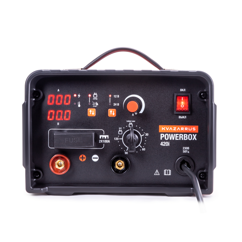 KVAZARRUS PowerBox 420i - профессиональное универсальное устройство, сочетающее в себе функции заряда аккумуляторных батарей, используемых на дизельных и бензиновых двигателях, и запуска автомобильной и другой техники с такими двигателями. Зарядное устройство выдаёт максимальный ток зарядки при минимальном энергопотреблении благодаря технологии iExpert. Для обеспечения нормального функционирования всех режимов работы устройства достаточно бытовой розетки 230 В. Два дисплея отображают основные рабочие параметры - ток заряда, текущее напряжение подсоединённой АКБ и процесс заряда. Устройство обладает высокой степенью безопасности благодаря комплексной системе защиты от перегрузки, короткого замыкания, перегрева и несоблюдения полярности. KVAZARRUS PowerBox 420i подойдёт для владельцев бензиновых и дизельных автомобилей, мотоциклов и лодок. Для переноски также предусмотрена удобная ручка на корпусе. ПЗУ PowerBox с технологией iExpert сохранили все преимущества трансформаторной технологии и теперь представлены в гораздо более компактных и лёгких корпусах.ГИБРИДНОЕ УСТРОЙСТВО: Переключатель выбора напряжения аккумулятора (12 В/24 В) на передней панели позволяет установить нужное значение в зависимости от параметров подсоединённой батареи.ТАЙМЕР: Функция точного времени зарядки аккумуляторной батареи позволяет установить время заряда в интервале от 1 до 120 минут. По истечении заданного интервала устройство автоматически прекратит заряжать АКБ.ЗАРЯДКА ВСЕХ ВИДОВ АКБ: Универсальное зарядное устройство позволяет заряжать любые типы аккумуляторных батарей: AGM (свинцово-кислотные), GEL (гелевые), Li-ion (литий-ионные), WET (с жидким электролитом).ЗАЩИТА ОТ КОРОТКОГО ЗАМЫКАНИЯ: Для безопасности работы на передней панели установлен специальный предохранитель силовой цепи процессов заряда и запуска.НЕБОЛЬШОЙ ВЕС: Небольшой вес и компактные размеры пуско-зарядного устройства плюс ручка для переноски на корпусе предоставляют высокую степень мобильности. Это позволяет взять устройство с собой в дальнюю дорогу и не переживать за севшую АКБ.ПРЕИМУЩЕСТВА:2 дисплея для отображения тока заряда, текущего напряжения подсоединённой АКБ и процесса зарядаЦифровой амперметр для контроля заряда батареиЦифровой вольтметрПлавная ручная регулировка тока зарядкиНапряжение заряжаемых АКБ 12/24 ВЗащита от перегрузкиЗащита от короткого замыканияЗащита от перегреваЗащита от несоблюдения полярностиРучка на корпусе для удобства переноскиНебольшой весСтепень защиты – IP 20КОМПЛЕКТАЦИЯ: Инверторное пуско-зарядное устройство KVAZARRUS PowerBox 420i – 1 шт.; Предохранитель 100 А – 2 шт.; Токопровод красный «+» с зажимом – 1 шт.; Токопровод чёрный «-» с зажимом – 1 шт.; Инструкция по эксплуатации + гарантийный талон – 1 компл.; Алюминиевый кейс – 1 шт.; Ключ к замку алюминиевого кейса – 2 шт.
