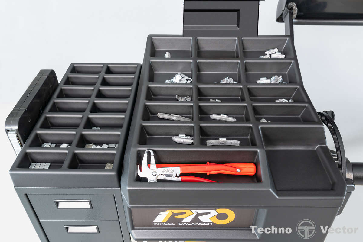 - Дополнительные емкости с выдвижными ящиками для хранения коробок с балансировочным грузами и других приспособлений.