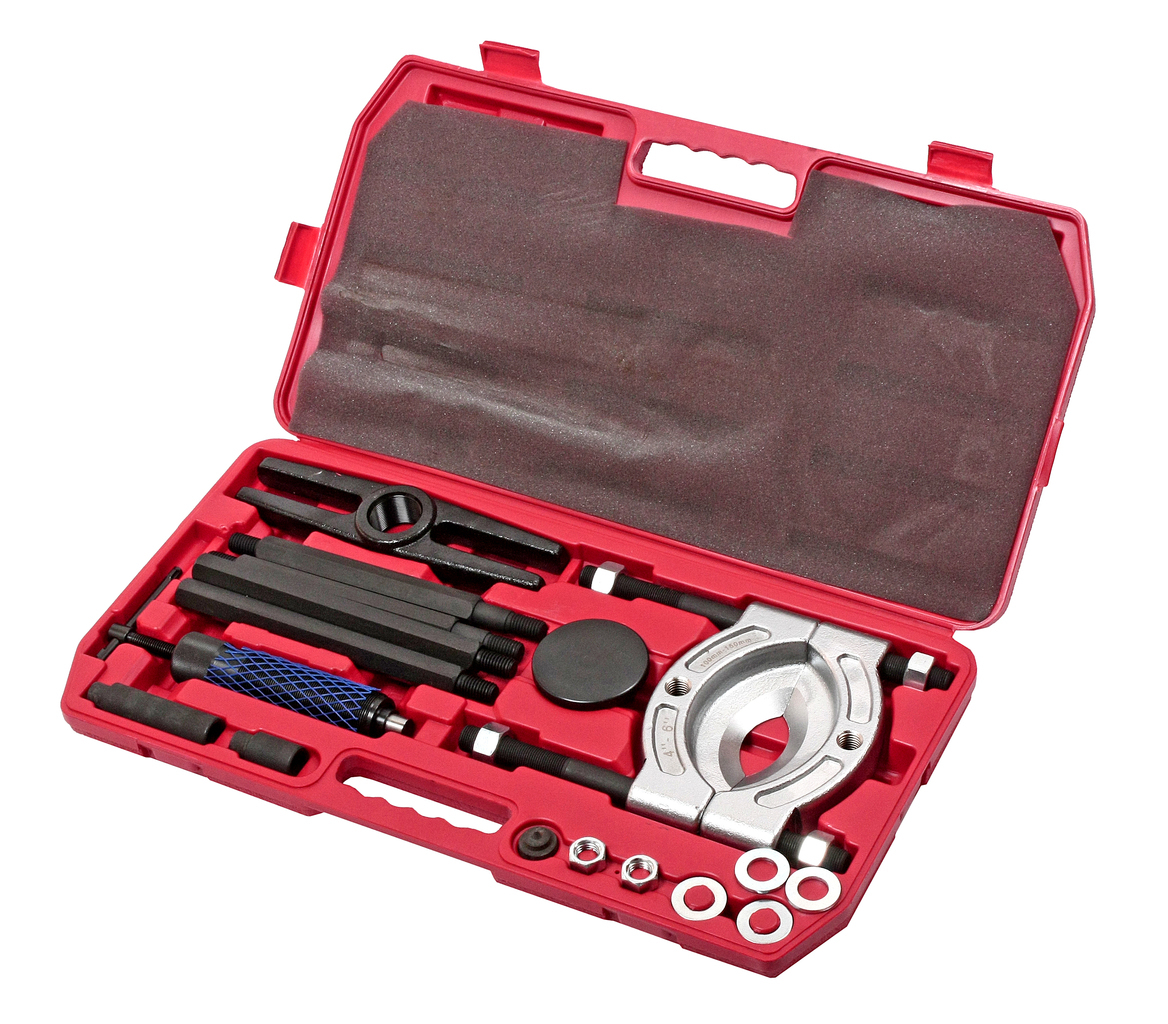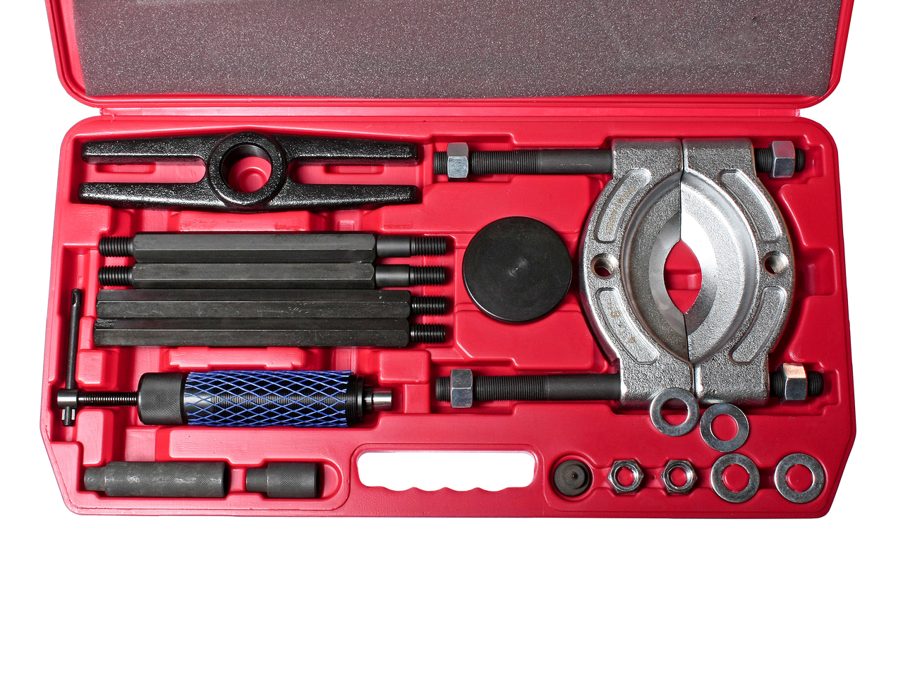 Демонтирует подшипник с помощью Н-образной балки и болтов.