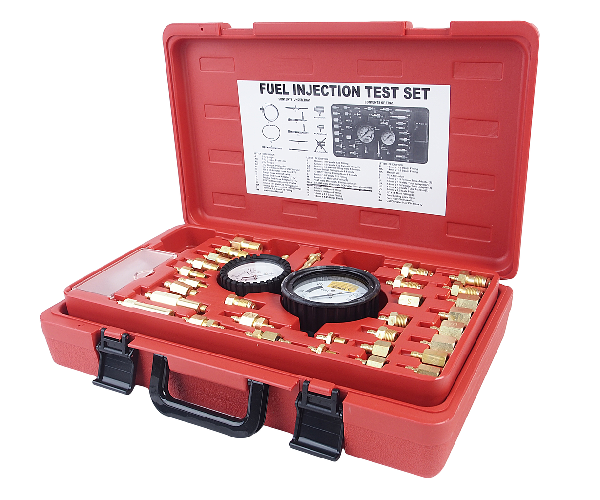 В комплект входят манометр 3-1/2'' со шкалами 0-145 PSI и 0-1000 кПа, манометр низкого давления 2-1/2'' (для давления ниже 15 PSI), адаптеры, шланги и разнообразные разъёмы для оперативной диагностики инжекторов, а также надёжный пластиковый кейс и руководство по эксплуатации.