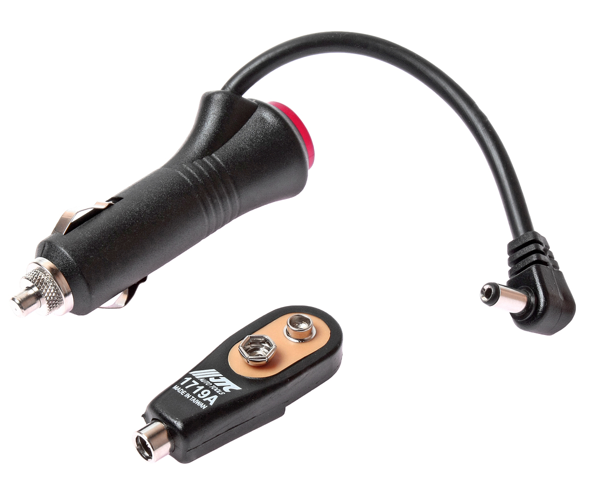 Работает при помощи аккумулятора на 9В, вставляется в прикуриватель.