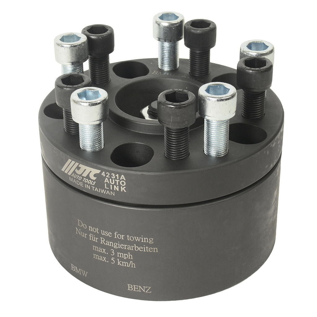 Приспособление устанавливается на ступице, затем на него крепится колесо и фиксируется колесными болтами.
