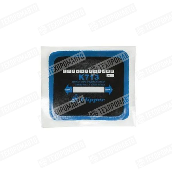 Пластырь кордовый K713 Clipper из серии заплат "K700" с усиленным армированным слоем. Предназначены для ремонта радиальных шин любых типов и размеров, порезов и проколов по беговой дорожке, в плечевой и боковой зонах. Устанавливаются методом холодной и горячей вулканизации. Пластыри оснащены синим адгезивным слоем, закрытого защитной белой майларовой плёнкой с надрезом посередине, для удобства при удалении. Конструкция заплаты позволяет выдерживать высокие нагрузки при эксплуатации, благодаря сочетанию пластичности и высоким прочностным характеристикам материалов.